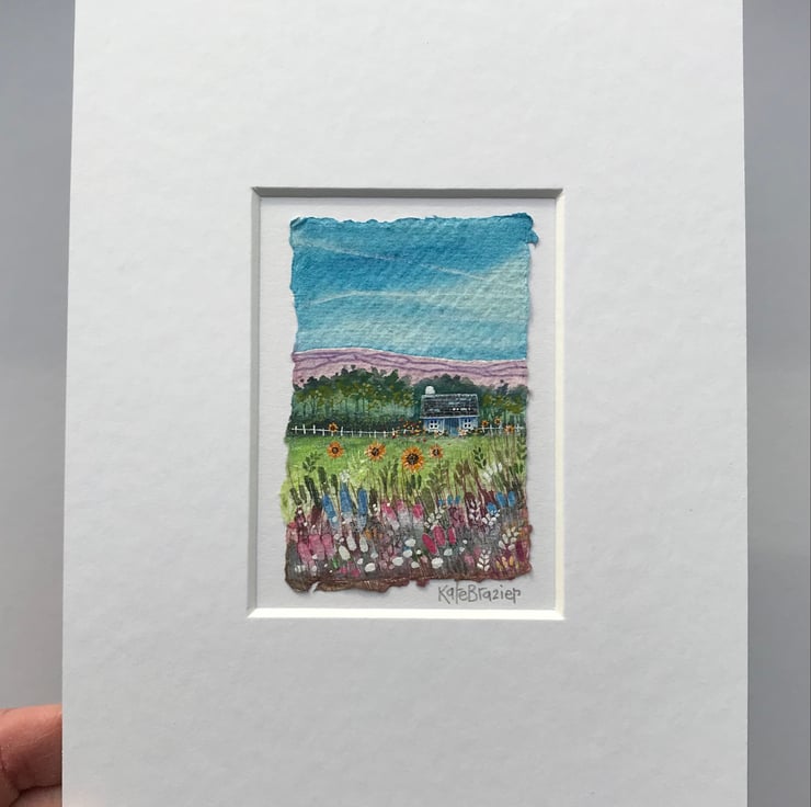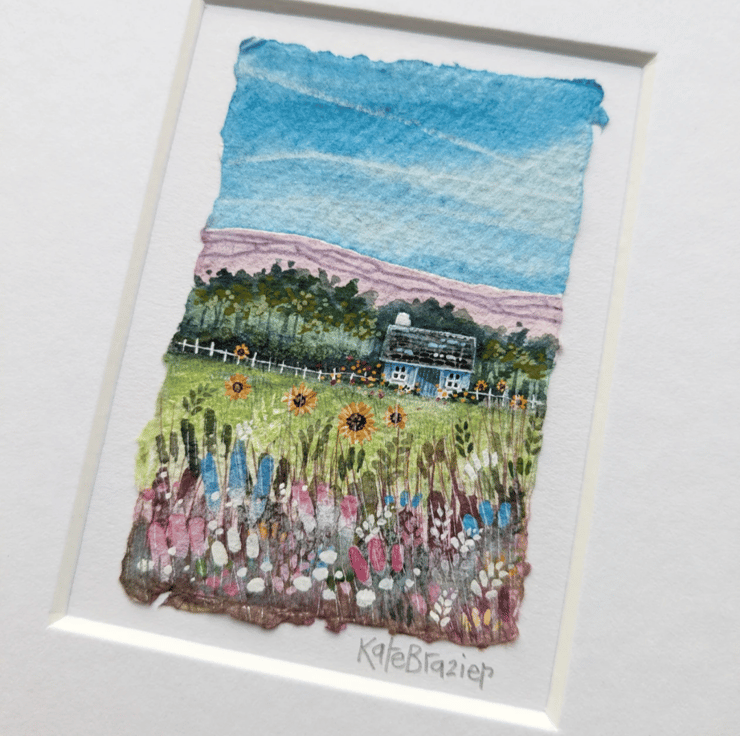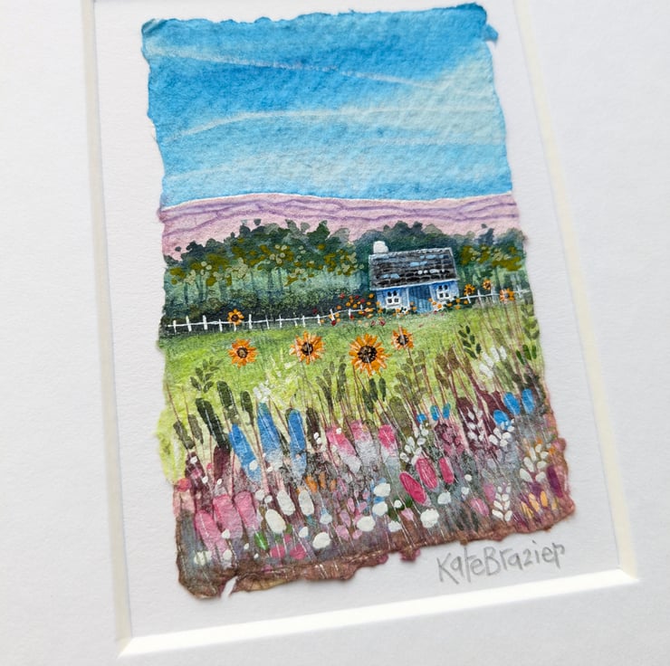 'Miniature Sunflower Cottage' is a tiny, mixed media miniature float mounted into a custom A5 mount.