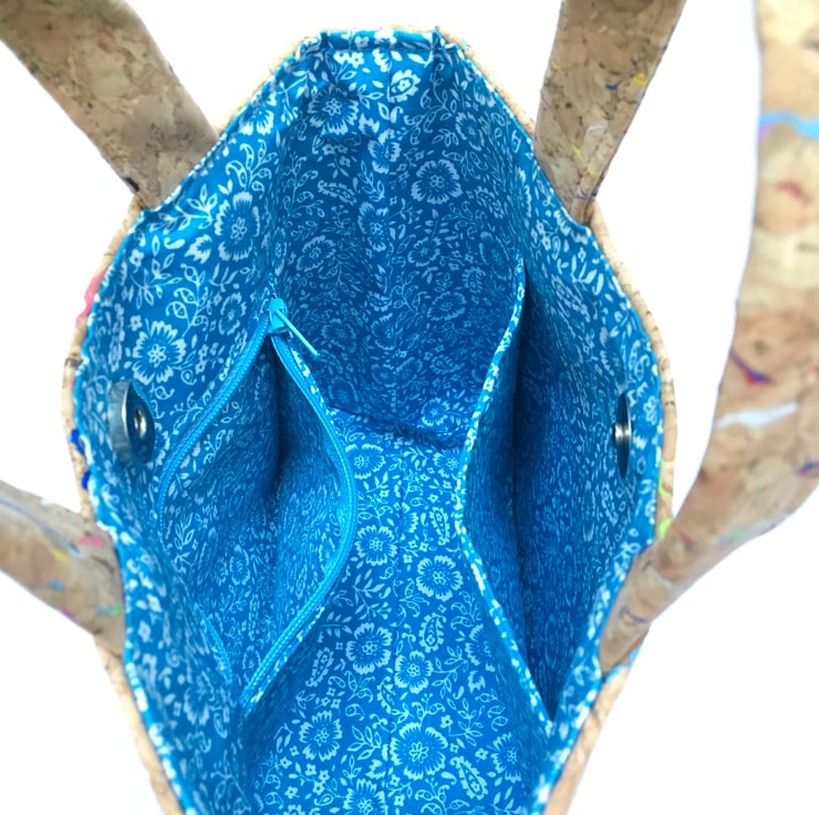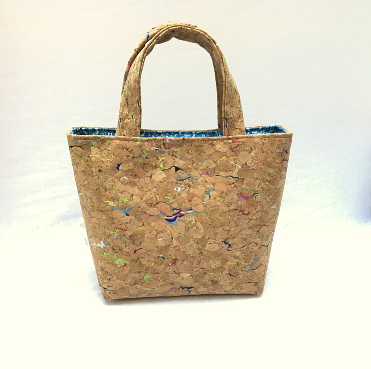 This totally dinky bag is perfect for just your essentials. This one is made from cork leather with dashes of bright colours in the cork.