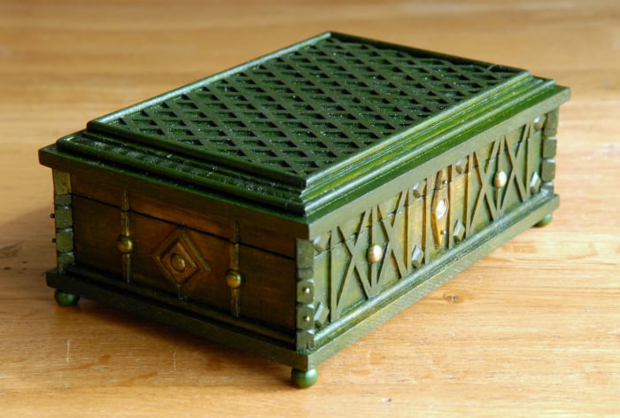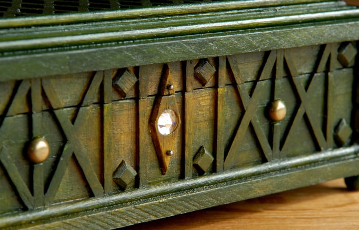 The box is painted with gloss dark green acrylic paint and has a clear crystal on the front set into a wooden surround with tiny gunmetal studs above and below. There are brass studs either side of the crystal and three more studs on each side with a wooden accented design. The design on the back mirrors the front, minus the and brass studs and crystal. Handmade wooden accents adorn the corners with two tiny gunmetal studs in each.