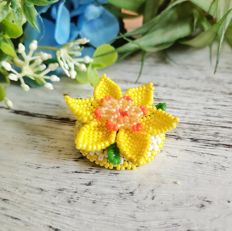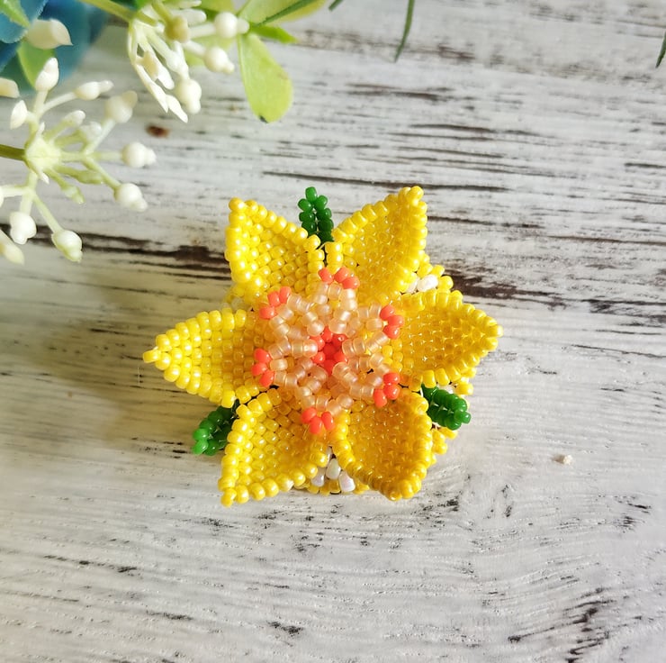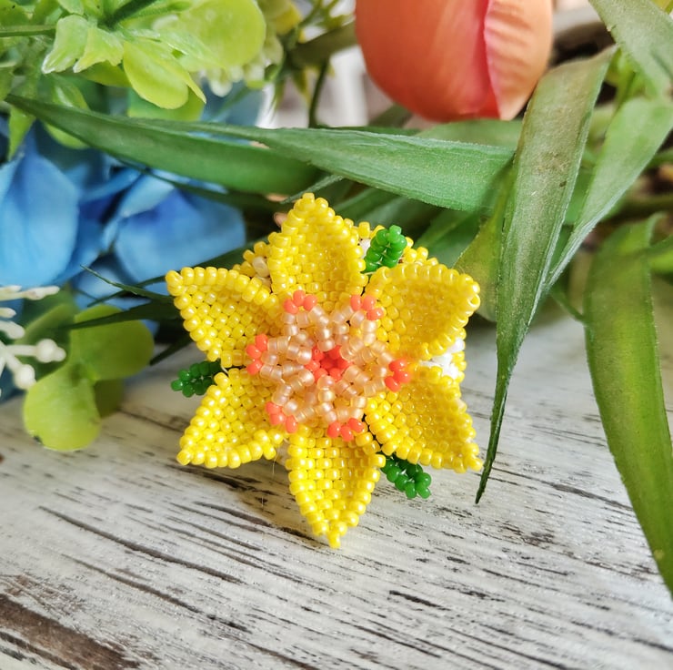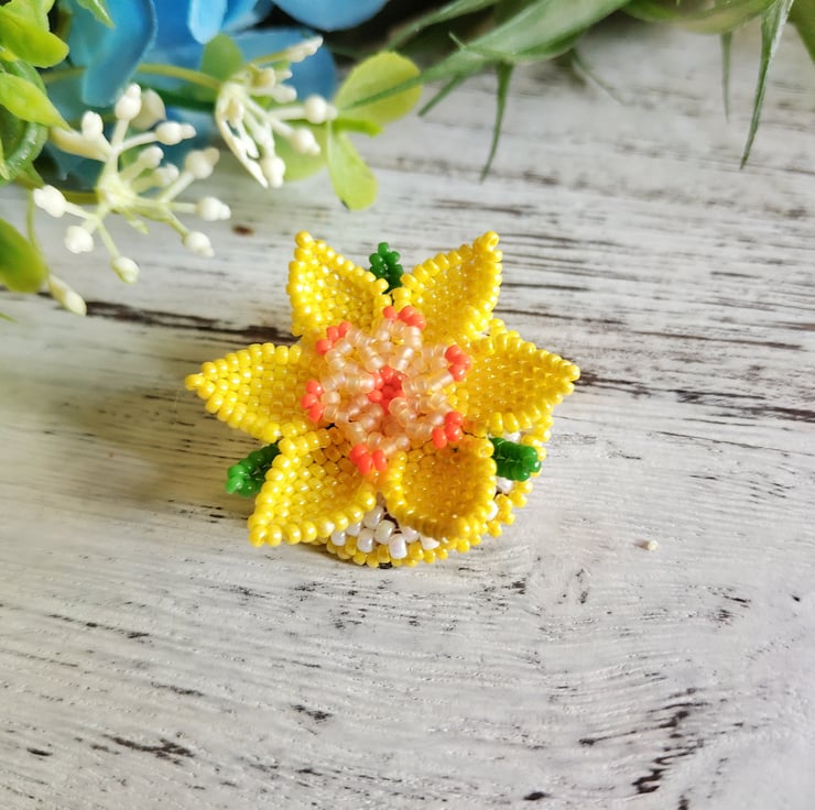 Bring some sunshine to your Spring look with our handmade beaded yellow daffodil brooch. Handcrafted using high quality Japanese glass Miyuki beads, this ornate, hand-sewn flower brooch brings a splash of colour and botanical prettiness to every outfit.