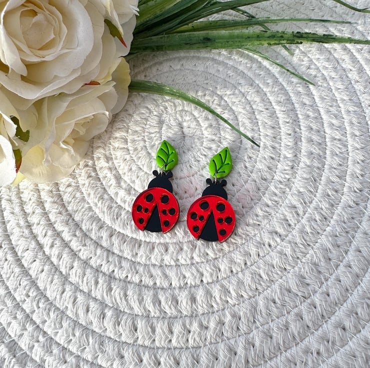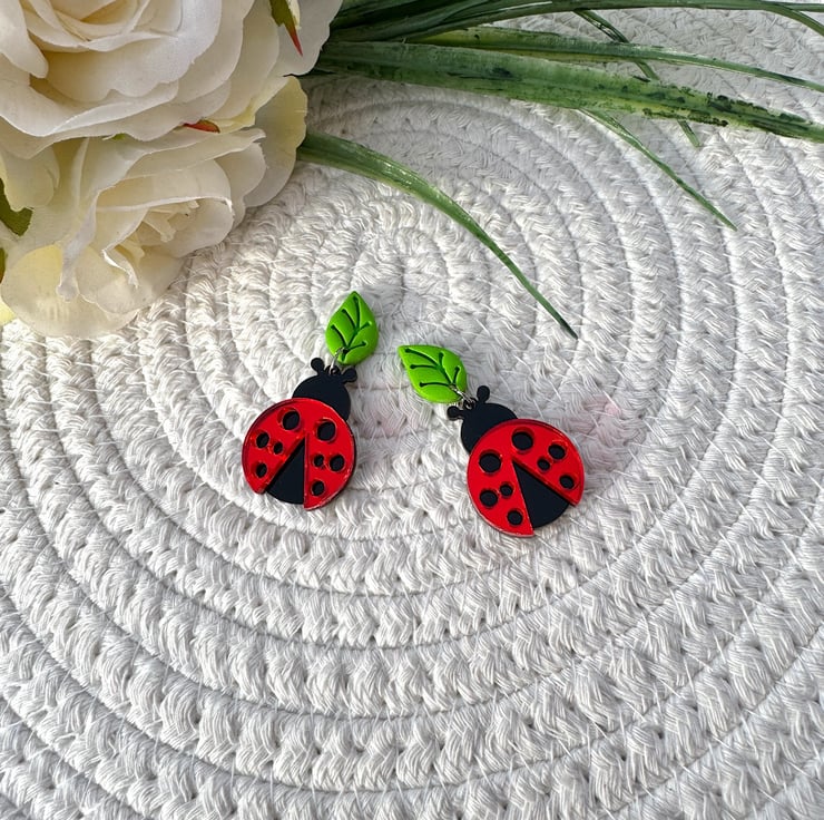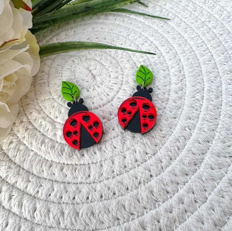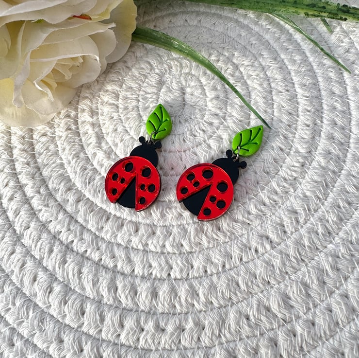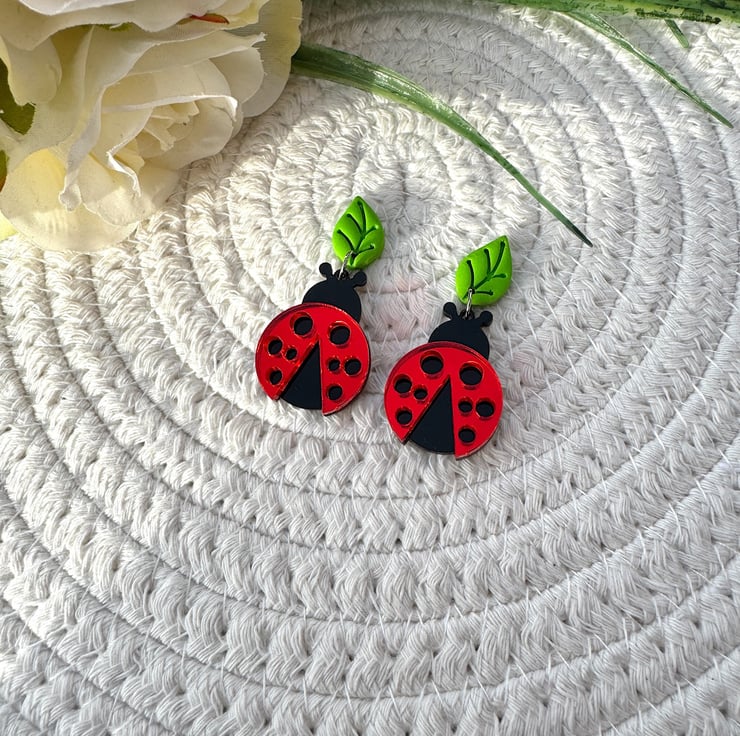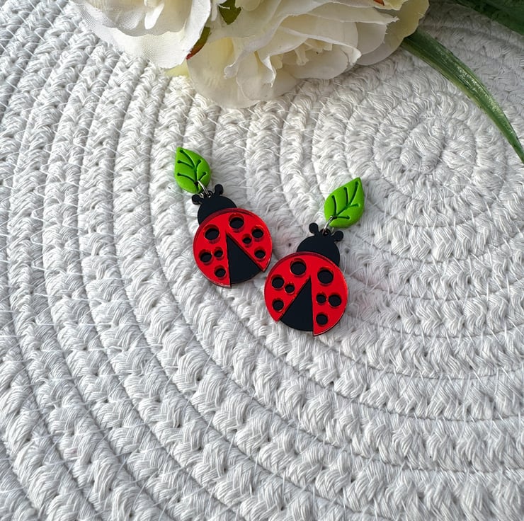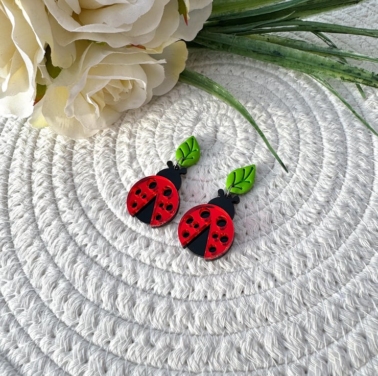 Made from layered Black and Mirrored Red Acrylic with a Bright Green embossed Polymer clay Leaf to finish.
