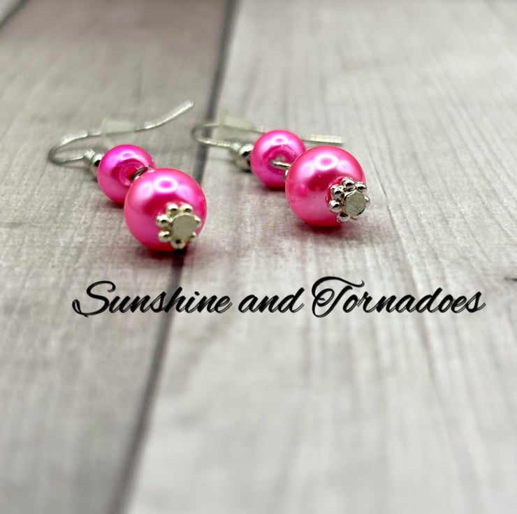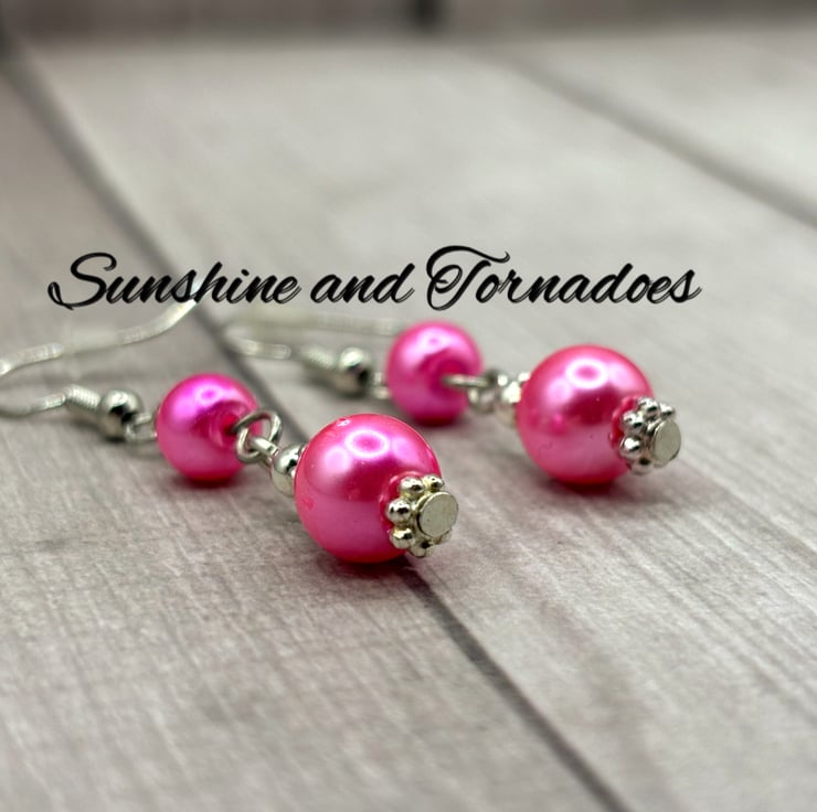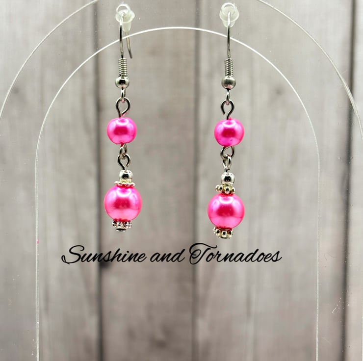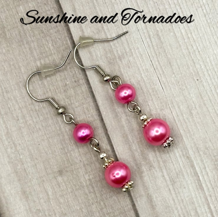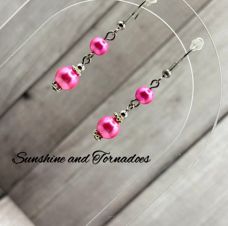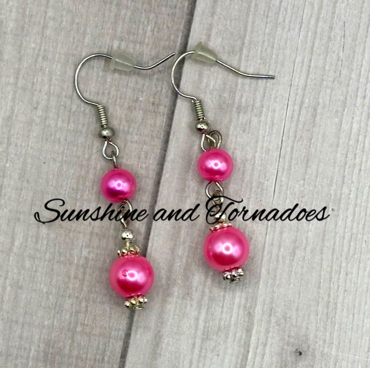 These simple yet beautiful drop earrings have been made using beautiful deep pink Faux Pearl beads set on Hypoallergenic Stainless Steel head pins.