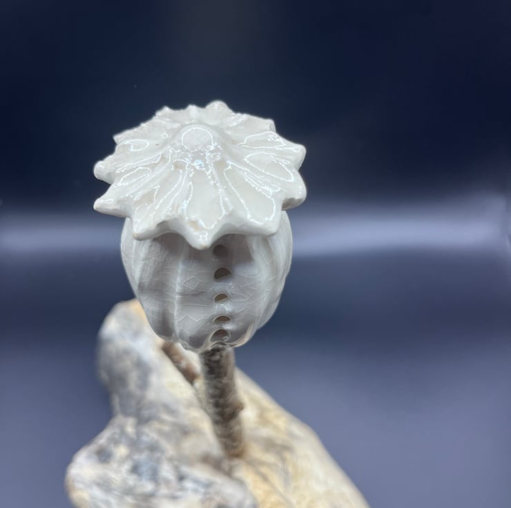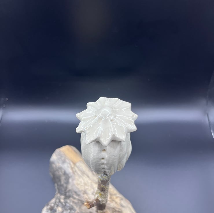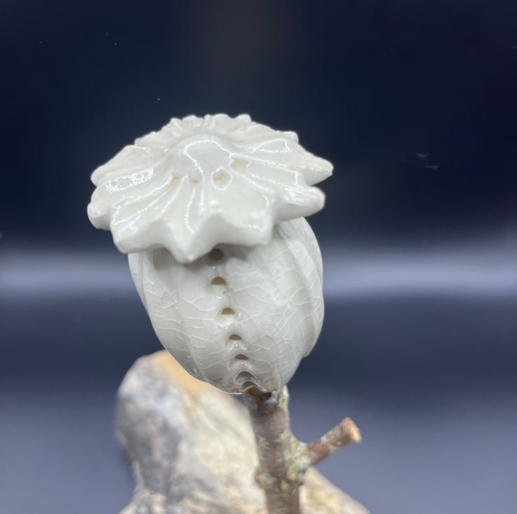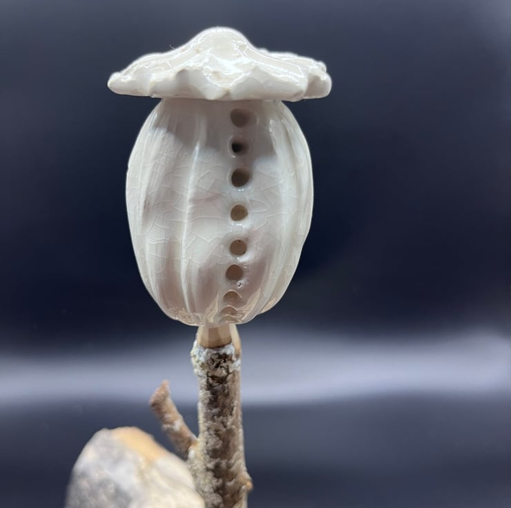 Ceramic seed pod …65mm high & 45mm wide…7mm in base to insert a small cane or branch…made with white clay and glazed …fired at 1060c…