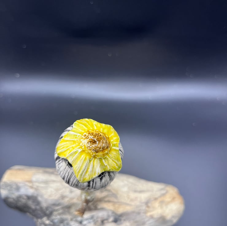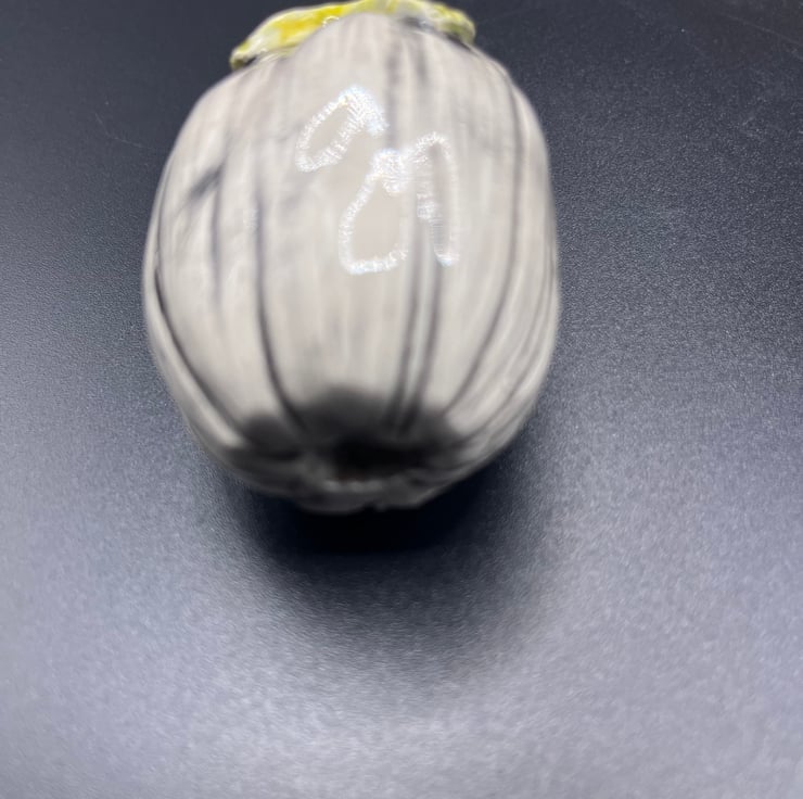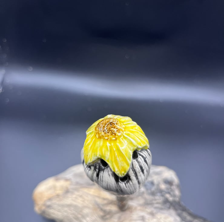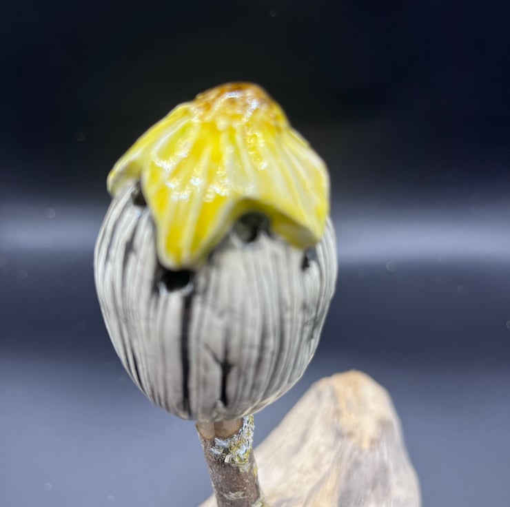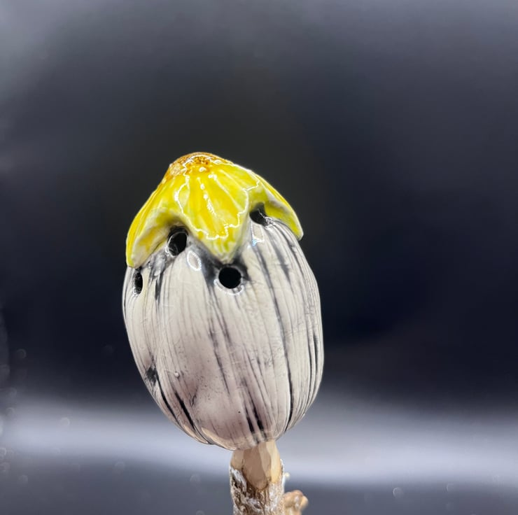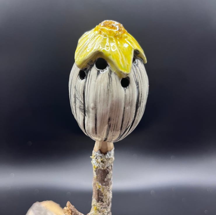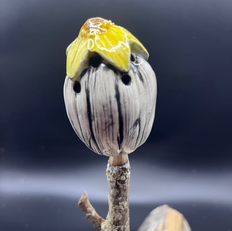 Ceramic seed pod …handmade in white clay…glazed in black / yellow /green & brown…6/7mm hole in base for a small cane or branch (not supplied) …60mm high and 40mm wide …