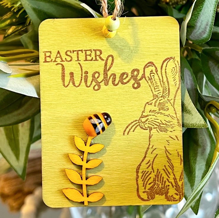 The first decoration measures 8x6cm and has a bunny design with the stamped words ’Easter Wishes’, it is finished with a wooden flower and bee as well as yellow & green beads on the rope string.