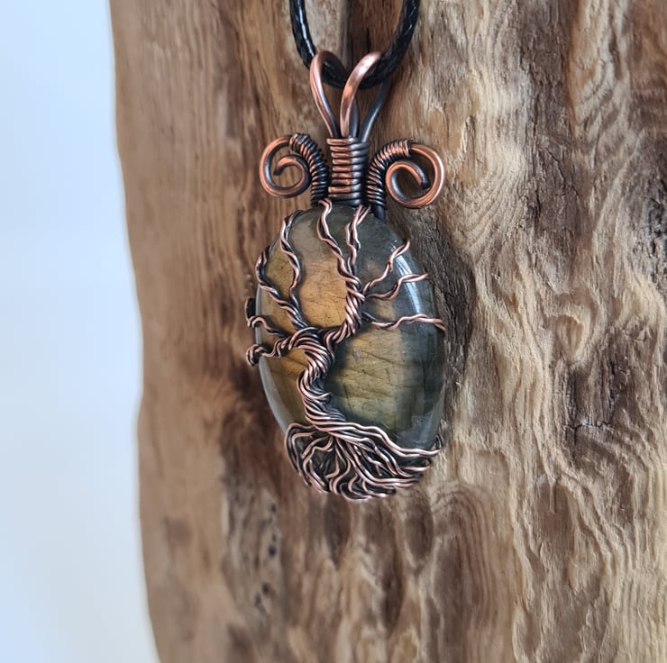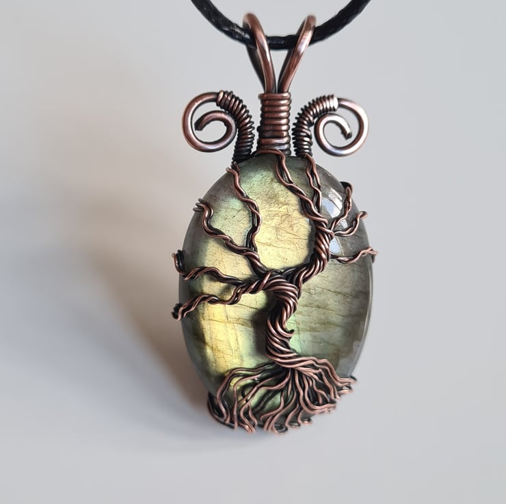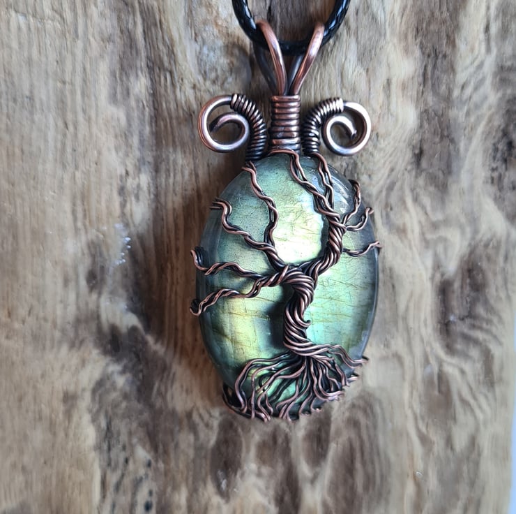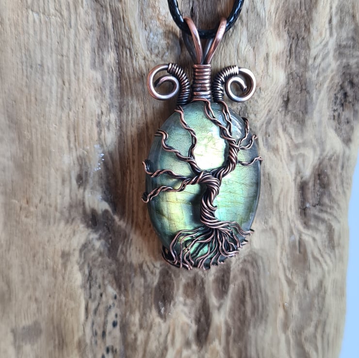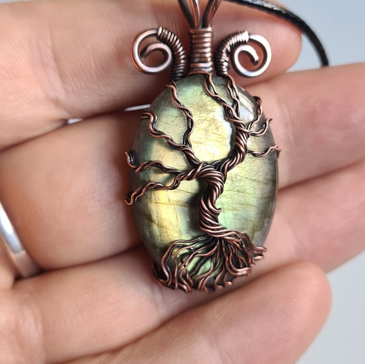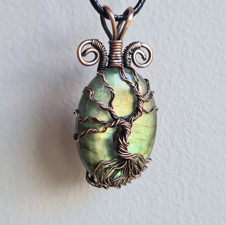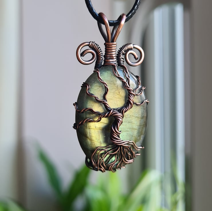 I have created this stunning and very unique Tree of Life Statement pendant using this beautiful Natural green Labradorite crystal, which I have wrapped with copper featuring this gorgeous copper tree to the front. This crystal has a beautiful colour and flash and looks amazing teamed with the copper.