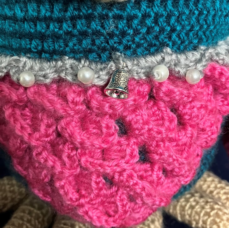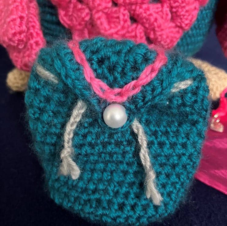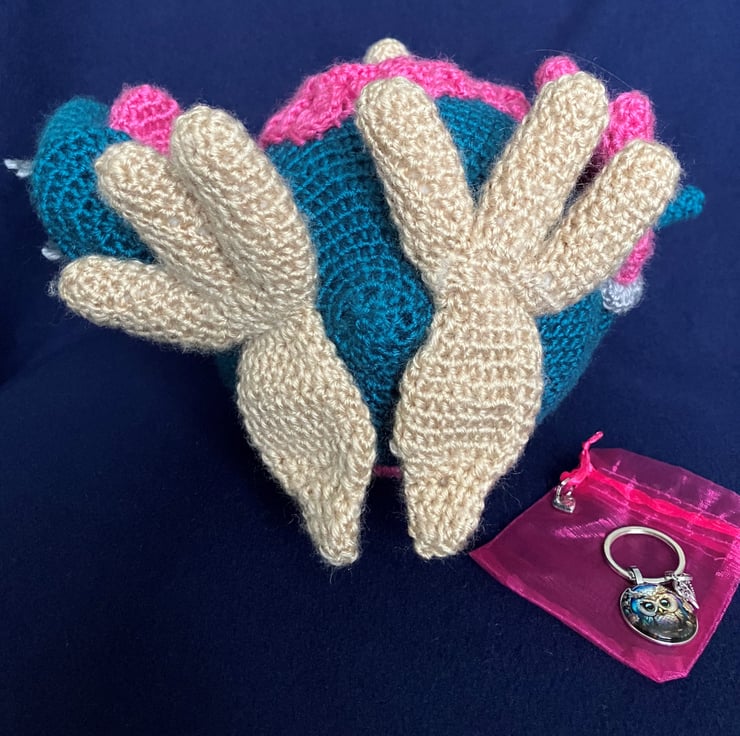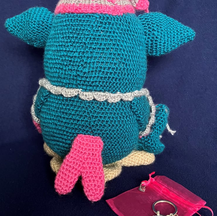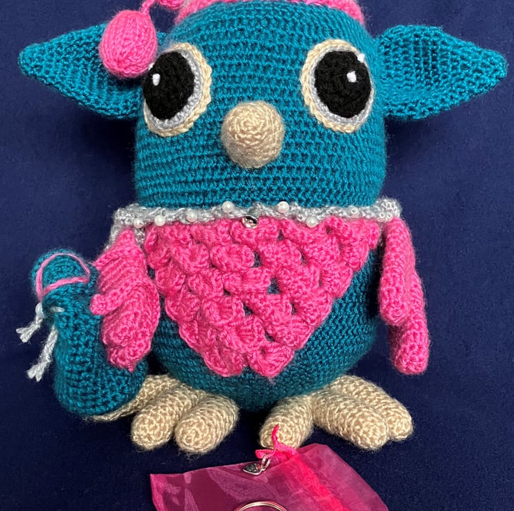 This is a handmade owl that has been part crocheted and part knitted it has an attached night cap complete with a bobble. The main shades of soft sheen yarn are Teal, Pink with silver grey trim. The owl’s beak and large feet are in a biscuit shade.