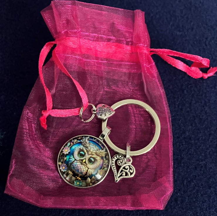 This night owl has accessories: a backpack in the same colours, which can be detached and used. Plus, a silver tone keyring that has an owl picture and a pink organza gift bag.