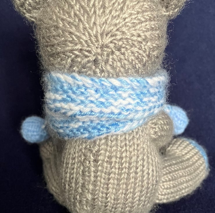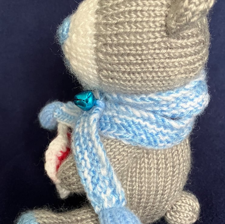 The bear wears a blue and white scarf with bobbles and a blue bell.