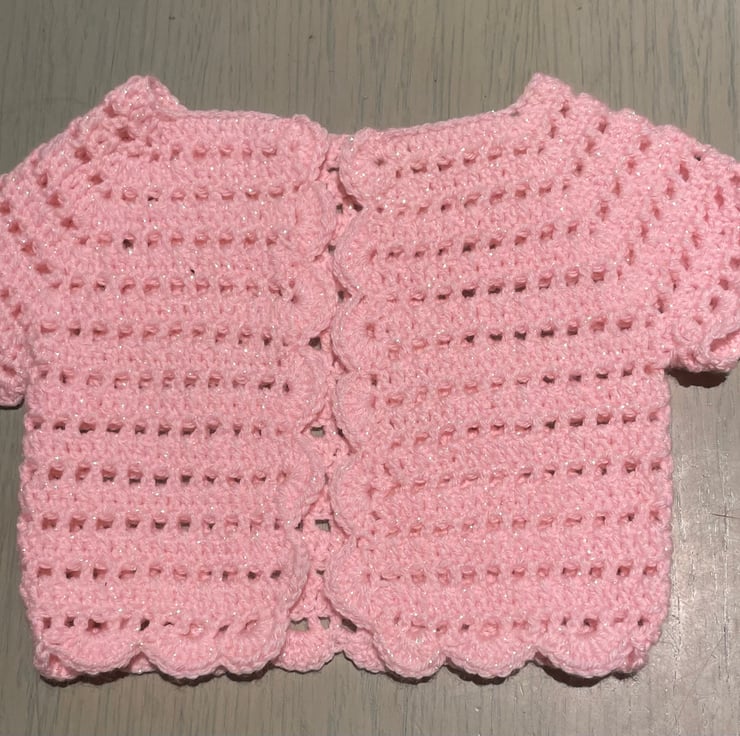 A lovely crocheted baby cardigan/bolero. Lace pattern with shell edging.
