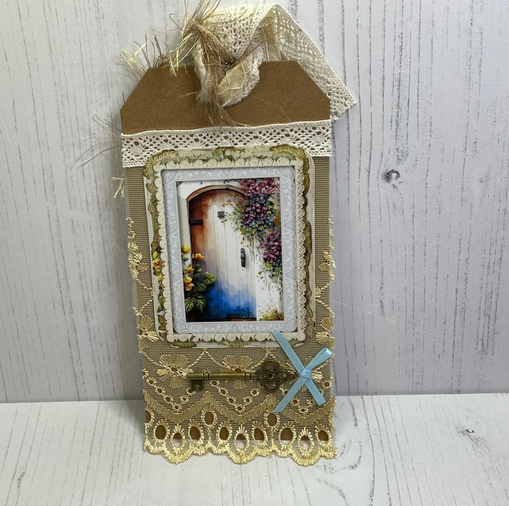 Set of 3 Kraft card tags embellished with lace as the background. Pretty door photo image with a blue ribbon and key charm. Topped with lace and fibres. Perfect for adding to a journal or a new hone tag. Measure 6.25” x 3”
