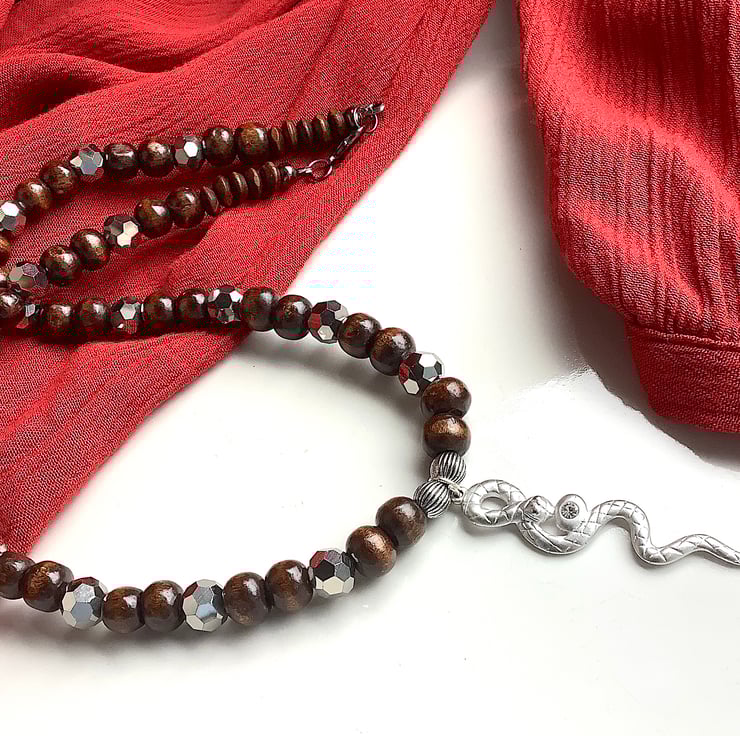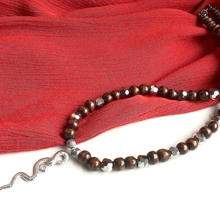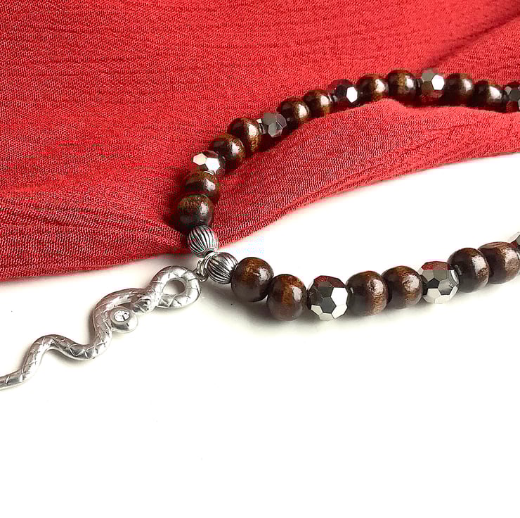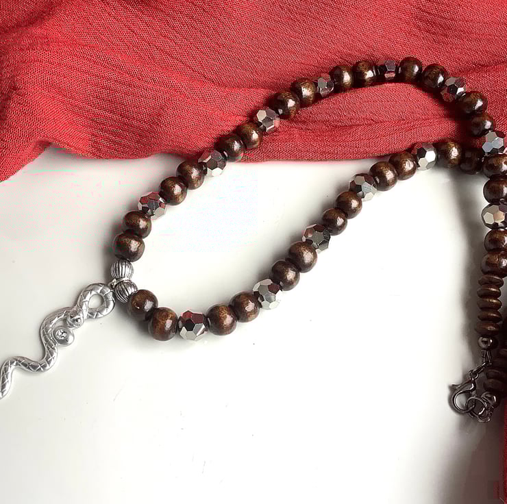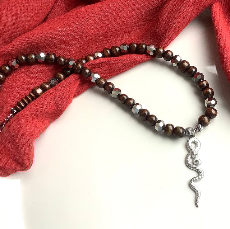 Earthy wooden necklace with up cycled snake metal pendant and shiny spacer beads
