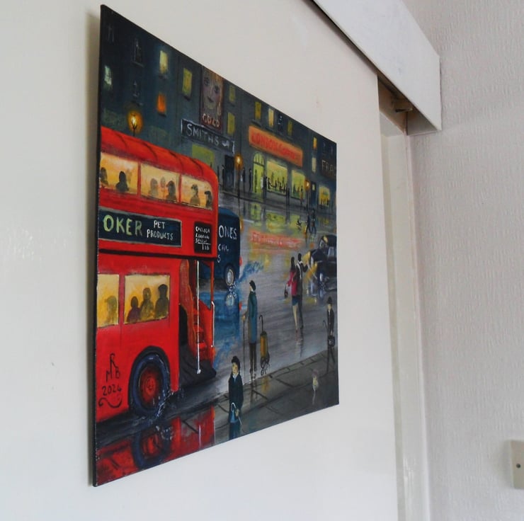 Painted on a canvas panel / board in acrylics, and finished in oil varnish. Size is 16" x 12". We have glued a cord hanger on the back...see photo.