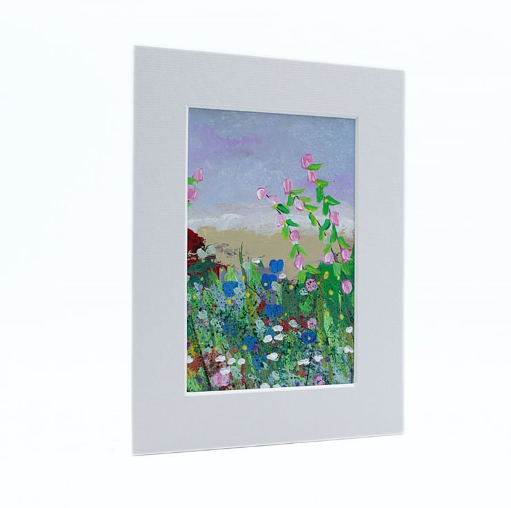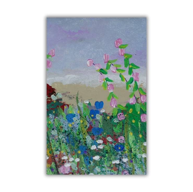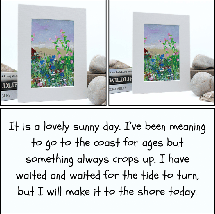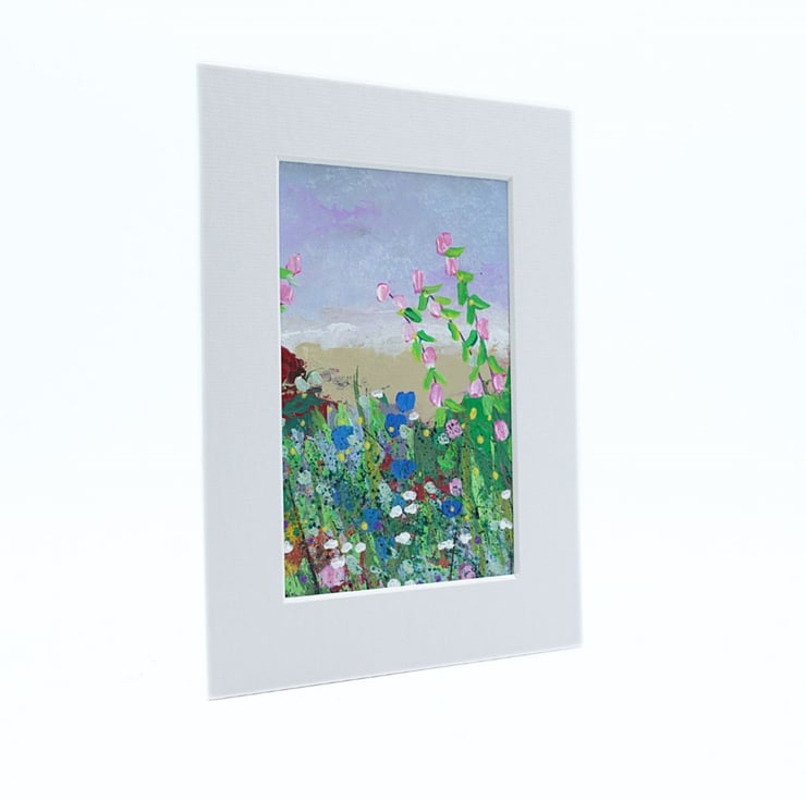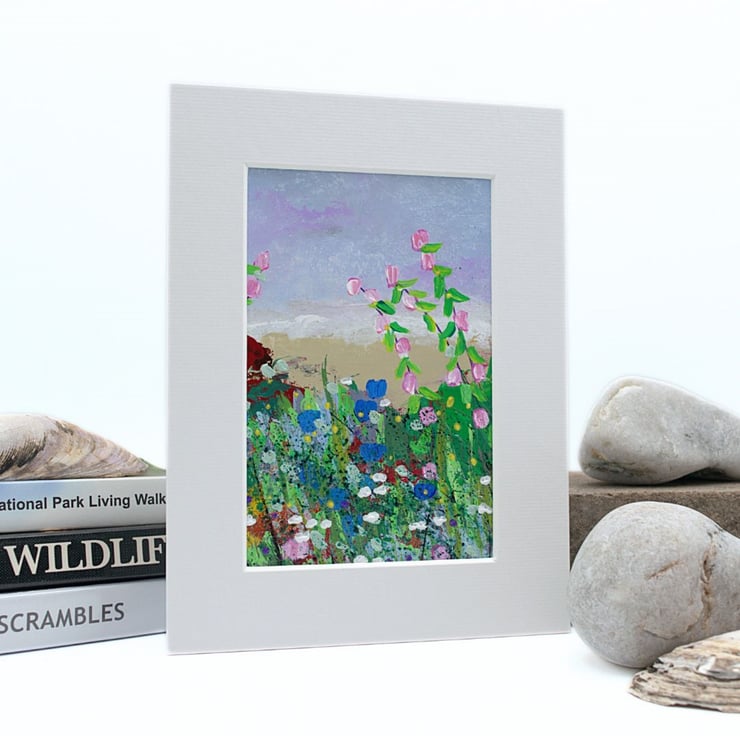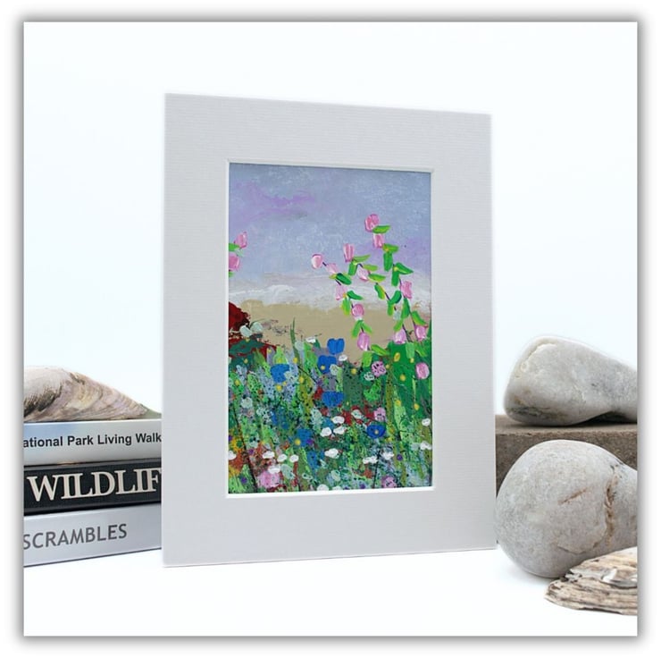 This is a small original painting of a beach in Scotland. The sea is calm and inviting and waves gentle lap over the sandy beach. In the foreground is a blanket of grasses and wildflowers. This mounted, acrylic painting has been created using professional quality acrylic paints and a mix of brushes, sponges and painting knives.