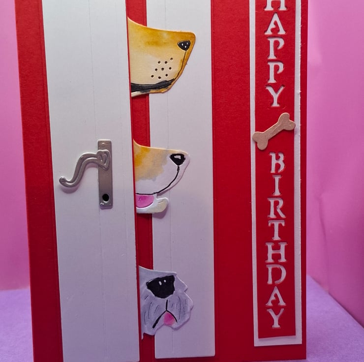 A cute birthday card with doggy noses peering round the door. Pawsome Birthday
