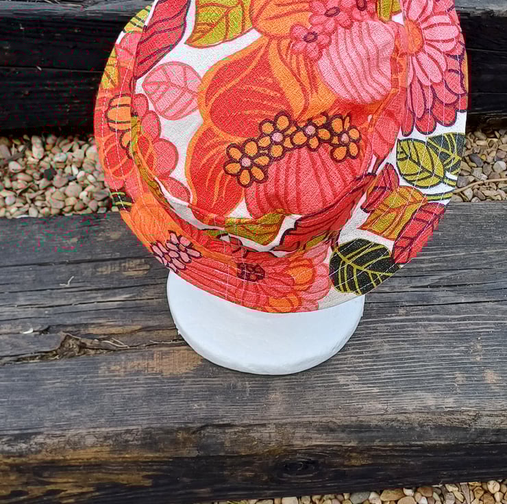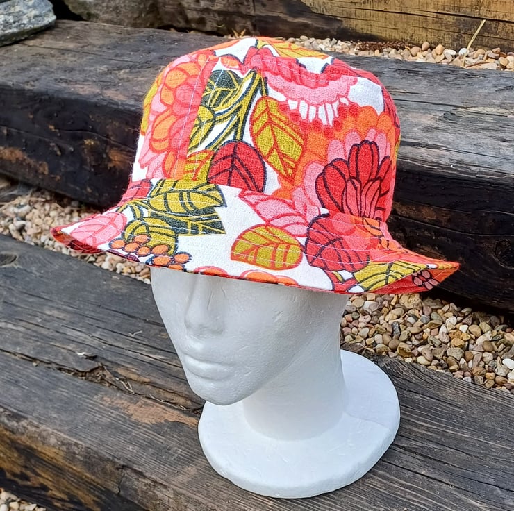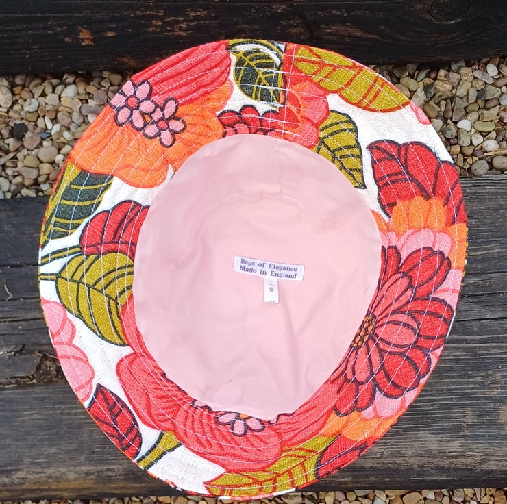 This bright floral bucket style sun hat is made from 100% cotton vintage bark cloth and fully lined in pink cotton canvas.