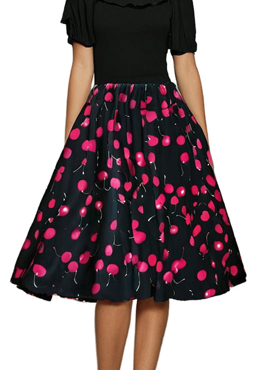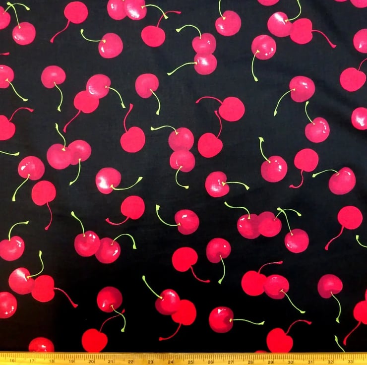 Handmade in Wales 1950s Vintage retro rockabilly full circle skirt, elasticated waist This skirt is made in a cotton poplin cherry print on a black background. It will fit multi sizes dues to the elasticated waist. 28" Long from top of waistband. This design has a built in tie belt