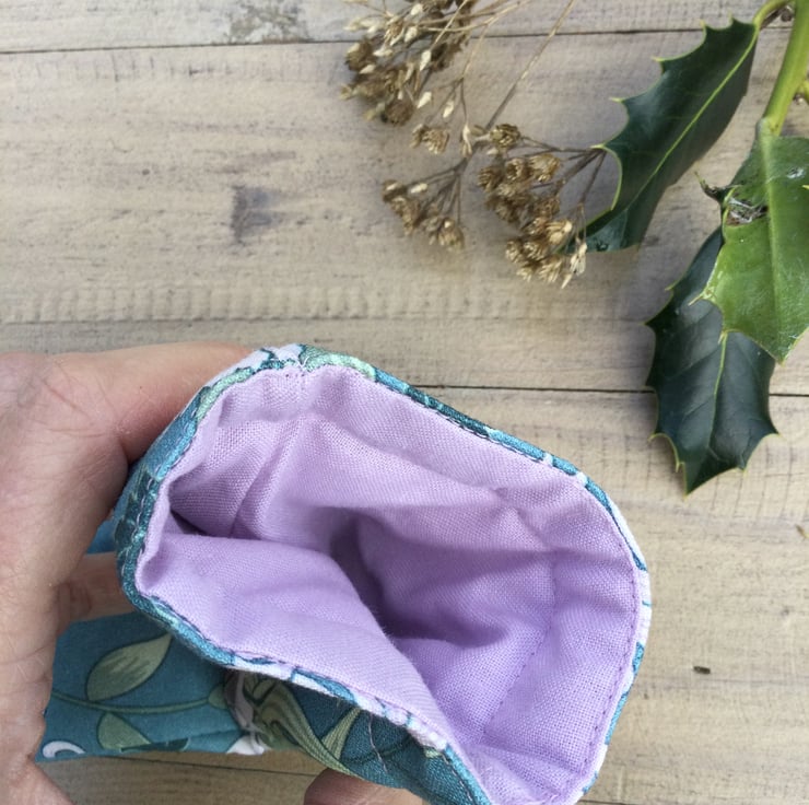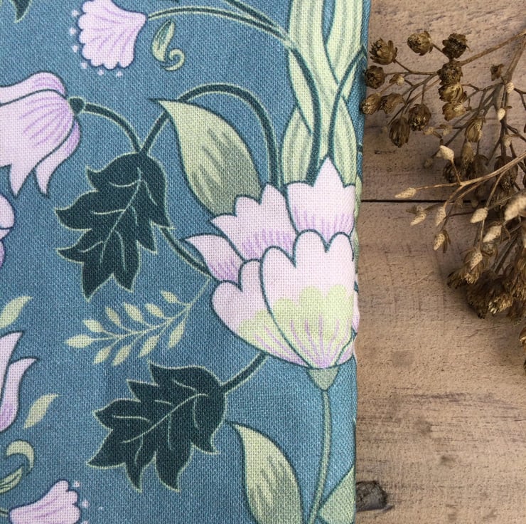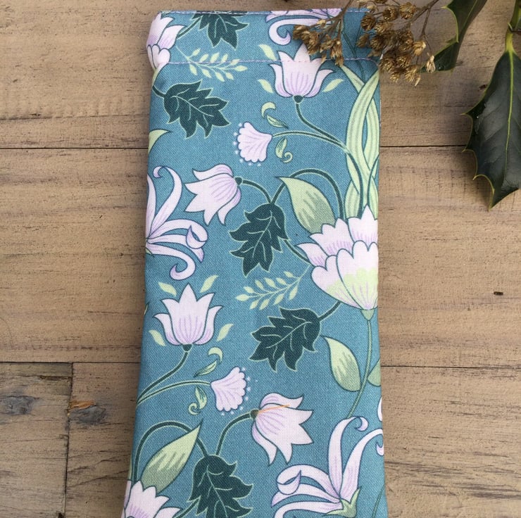 Cotton glasses case, padded with fleece and lined in lilac cotton. Gorgeous floral print in lilac and green on a blue background. Closure is with a magnetic popper. Perfect for keeping glasses safe when you need a lightweight alternative to a hard case, would make a lovely gift.