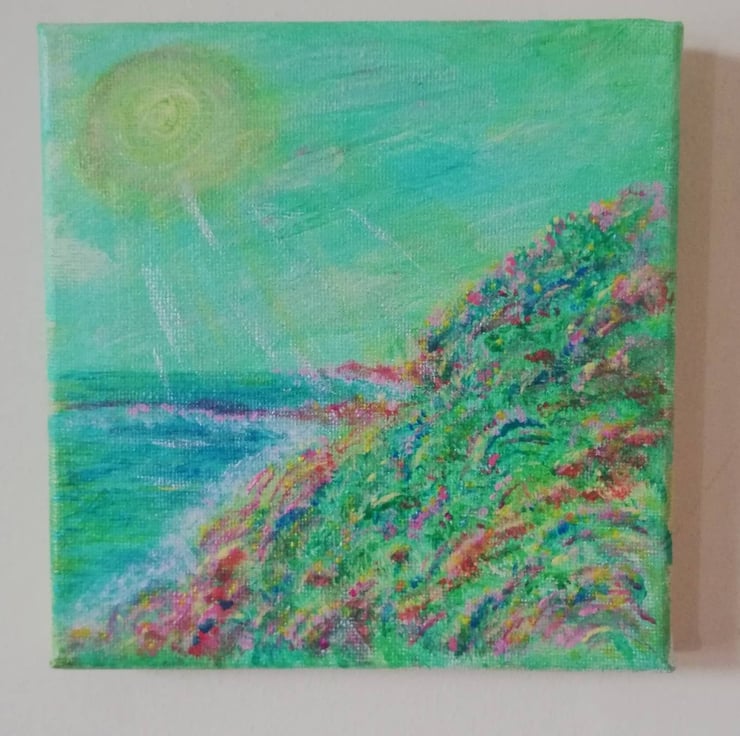 I painted this after a visit to Rhos on Sea and added my own slant to it of course. I like using different colours to represent different moods of the weather - the green and blue in the sky, the red and pink to frame a border or piece of land and the multicolours to represent the various flowers. Anyways, enjoy. Thanks Nina xxx
