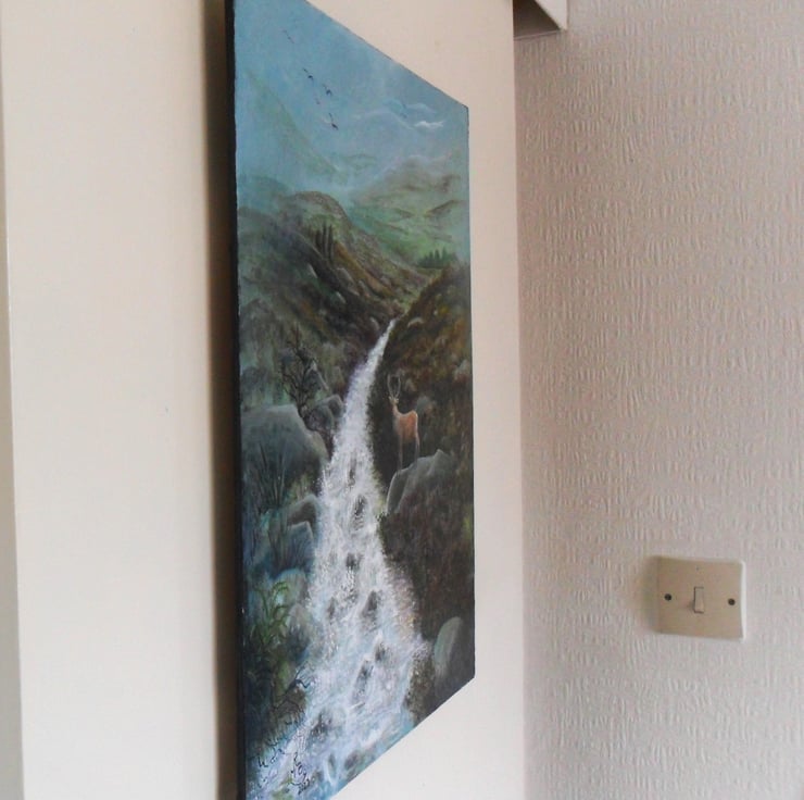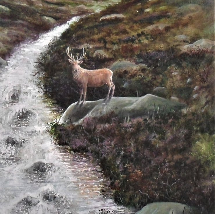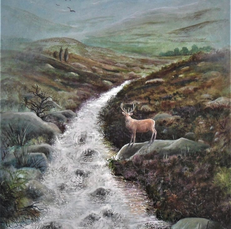 The painting is of a Scottish glen, with a beautiful stag standing on a rock.