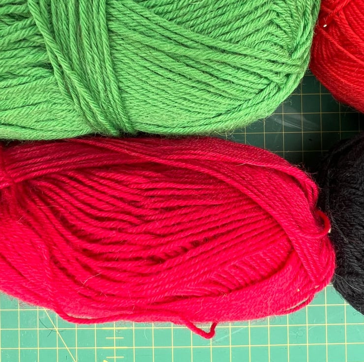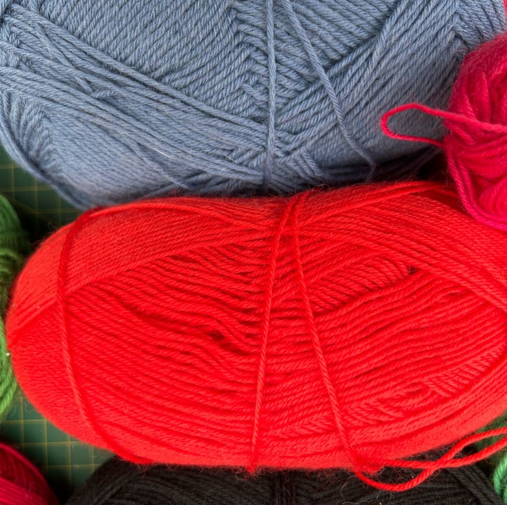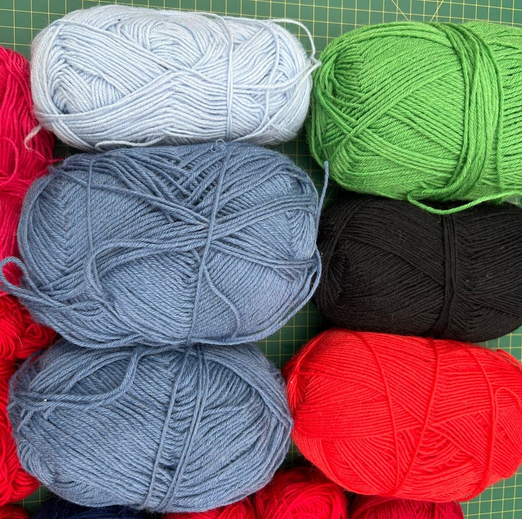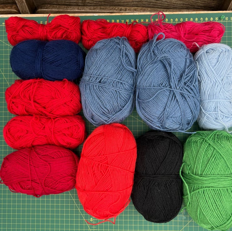 They might not have their ball bands any more, but I can tell you that these are minimum 75% wool content. Five full 100g balls and five 50g-plus balls, with a few extra bits thrown in. Four-ply and six-ply sizes. They come from an expert German sock-knitter so might be German sock wool brands.
