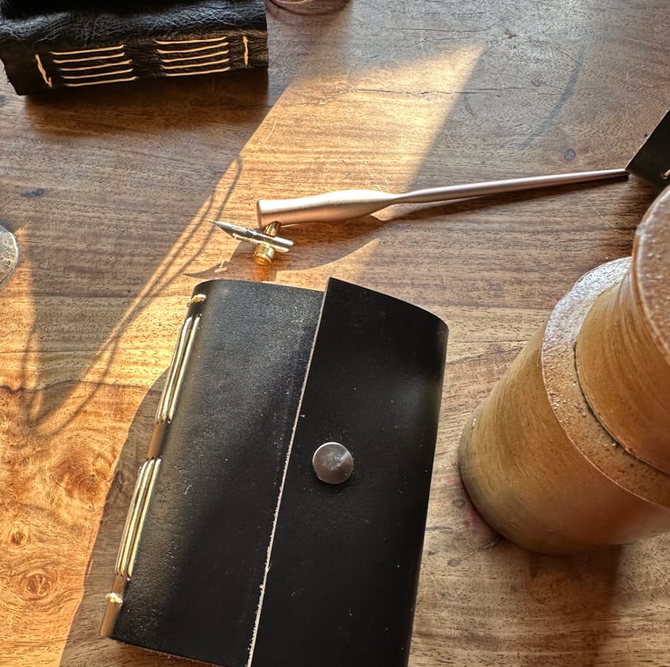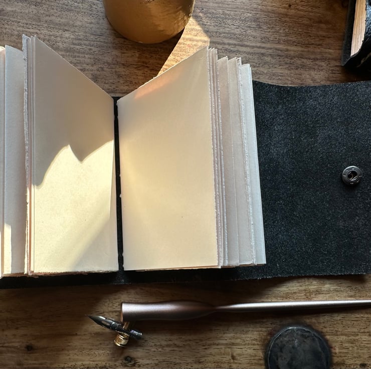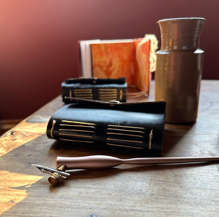 Up-cycled Black stiff leather cover with ivory waxed thread long stitch binding, hand made pocket Journal.