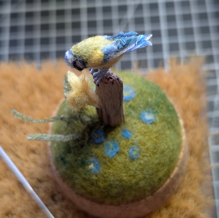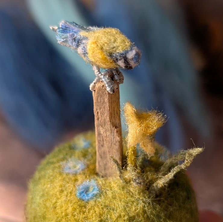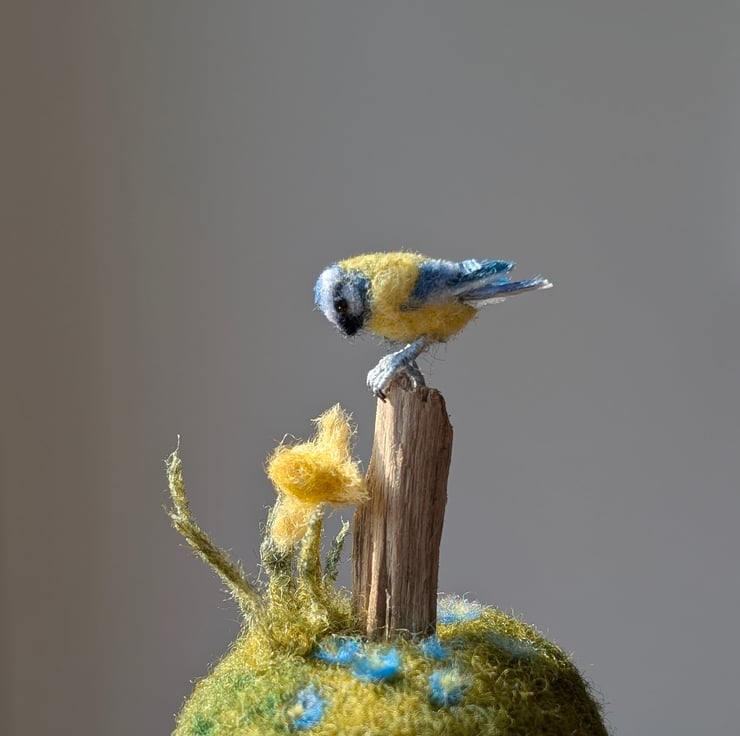 A tiny and perfectly formed to-scale wool Bluetit perched on a driftwood post, above a mossy woollen tuffet dotted with Forget-Me-Nots and staring down at a bright yellow woolly daffodil, welcoming the Spring.