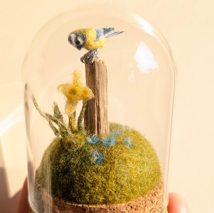 Entirely handmade, this needle felt bird is a miniature work of art with gloriously blue individual flight feathers, tiny blue wire legs wrapped in thread and minute claws at the end of each toe, a mini woollen beak and titchy tiny resin eyes, all scaled to 1:4 of life-size. Measuring no more than 2.5cms long and1.5cms tall, beside a 3cms tall daffodil flower and leaves, perched on a just over 3.5cms driftwood post, every springlike part of this tiny scene fits snuggly inside the 9cm high by 6cm diameter glass bell jar sealed with a cork stopper.