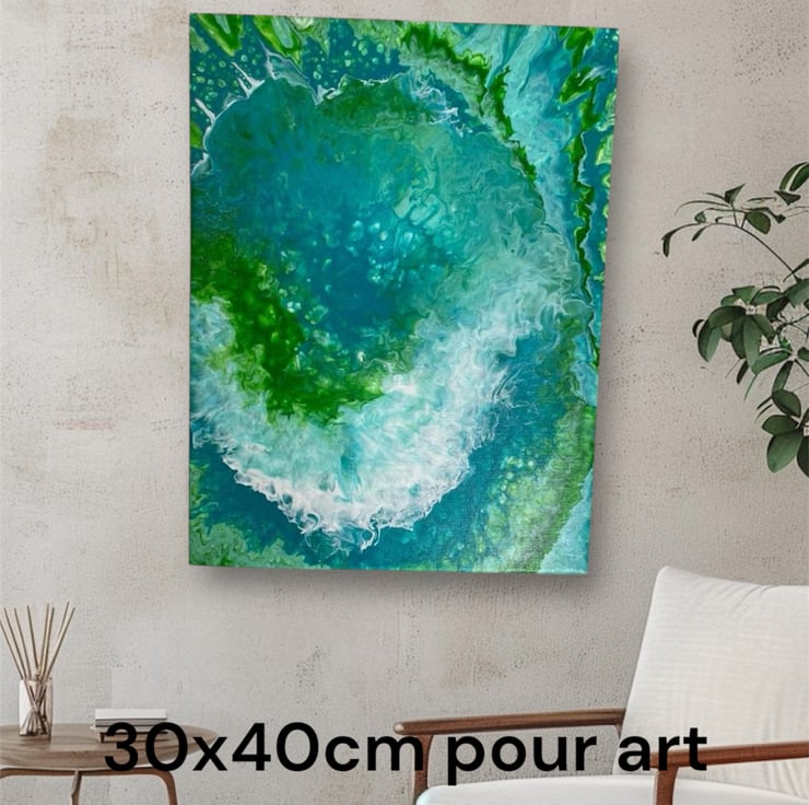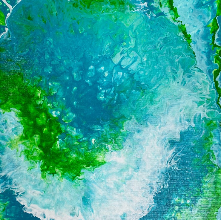 A unique, one-off, acrylic pouring paint art canvas in green and white. Sealed with a varnish for protection. Can be hung landscape or portrait. Suitable for an art gallery or any room in the home. Ready to ship.