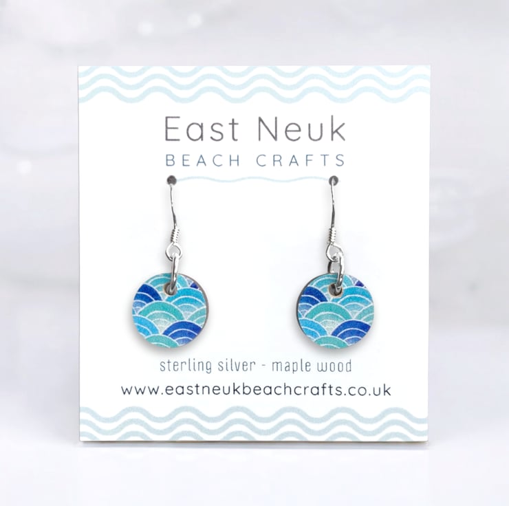 A cute pair of dangly earrings featuring a tiny wave pattern. Crafted from beautiful maple wood, the intricate design is printed in vibrant detail, taken from an original watercolour painting.