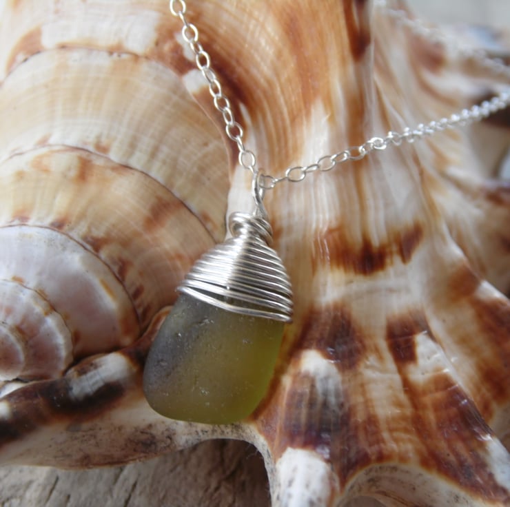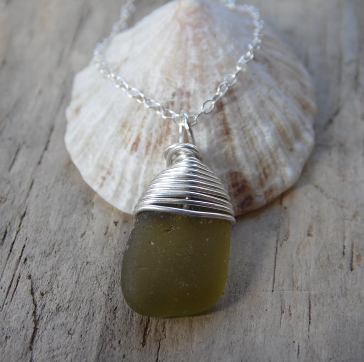 A beautiful piece of dainty light olive green Cornish sea glass wrapped with silver wire, made with sea glass found on Marazion beaches.