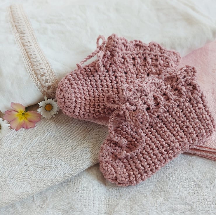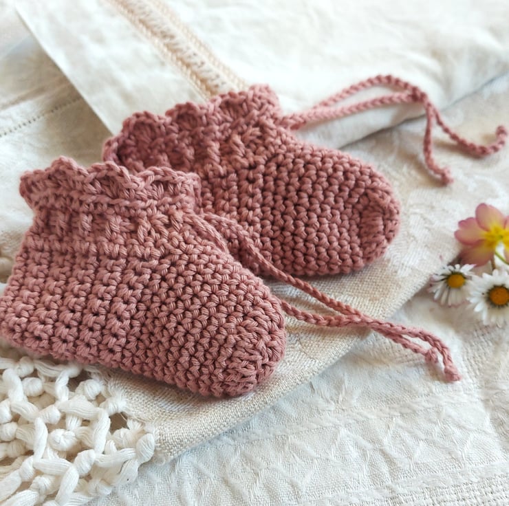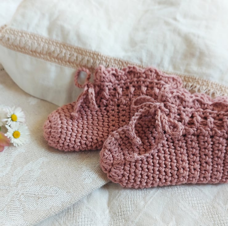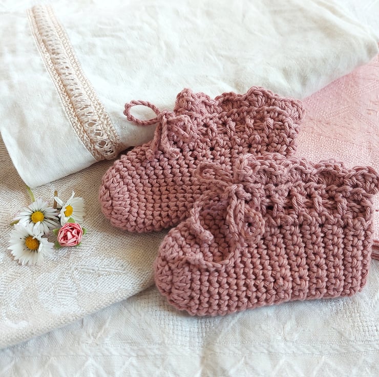 Booties need to be comfortable and not restrict your baby's feet. Please note that the measurements are only a guide, due to the different tension of the yarns and the individual crocheting of each unique handmade creation. The soft cotton stretches by 1 cm approx. Can fit from newborn up to 4-5 months, depending on individuals.