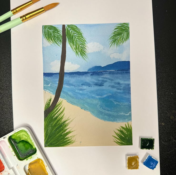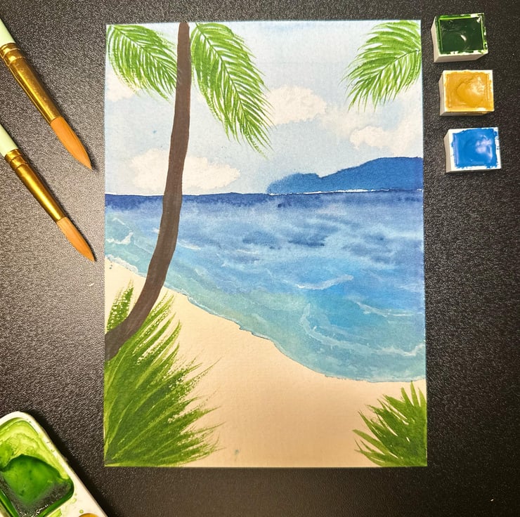 This watercolor painting was inspired by the paradisiacal beaches of Brazil, known for their unparalleled natural beauty and unique tranquility. The piece was born from a deep longing for seaside holidays, for calm and deserted beaches where time seems to slow down.