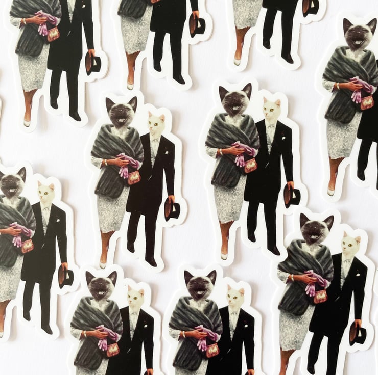 One funny cat sticker to adorn your notebook, laptop, phone, car, bike....there are a million uses for it! Make everything shimmer and shine! This cat couple are out on the town having a great time. He really knows how to make her laugh.