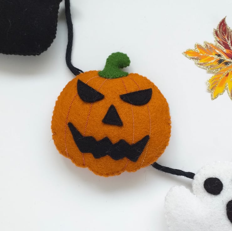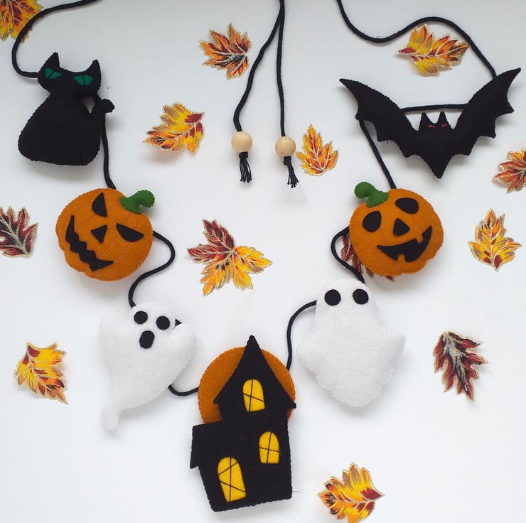The bunting has seven wool felt ornaments securely sewn onto chunky cotton yarn for hanging.
