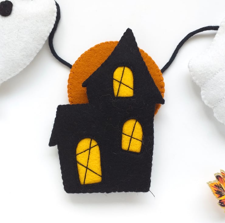 There is a cute black cat, a flying bat, two orange pumpkins, two spooky ghosts and in the middle a very haunted house