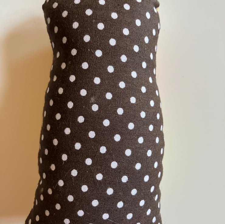 Hand embroidered face with bead eyes.She has a dragon on her tummy . The back has spotty white with brown fabric. Hang anywhere around your home from the twine loop. Approximately 20cm tall and 8cm wide. Stuffed with toy filling.