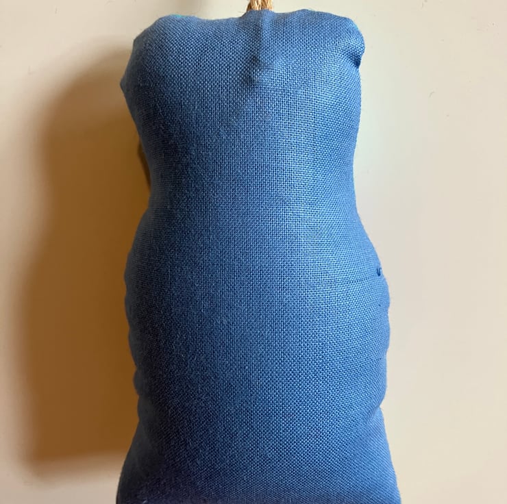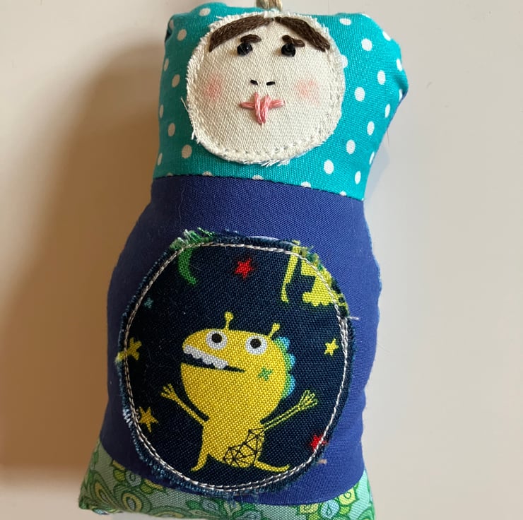 Hand embroidered face with bead eyes. An alien on her tummy, and a blue fabric back.