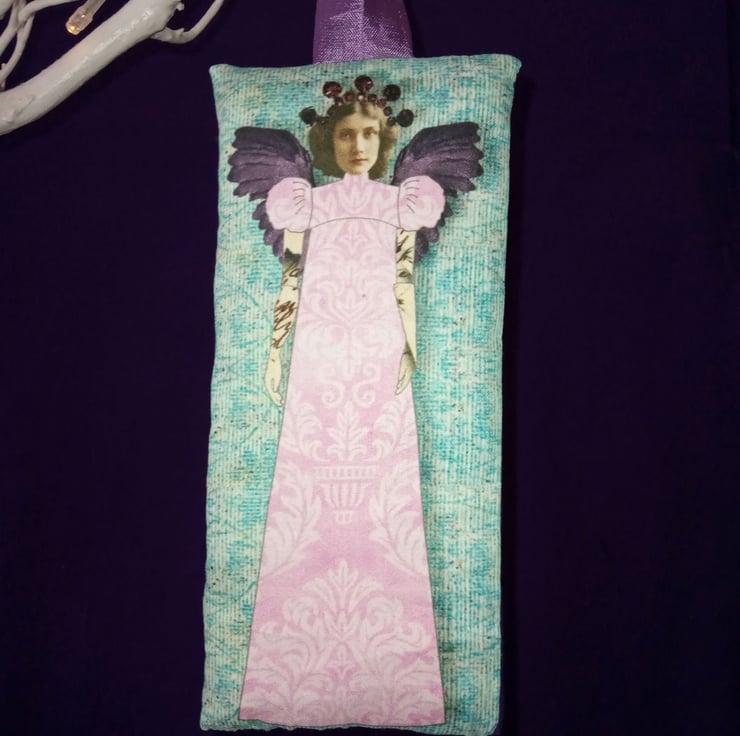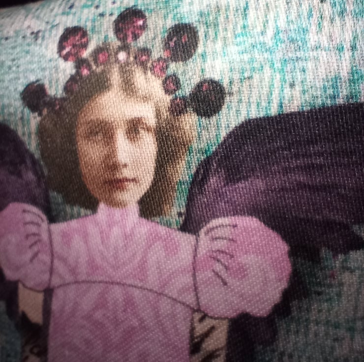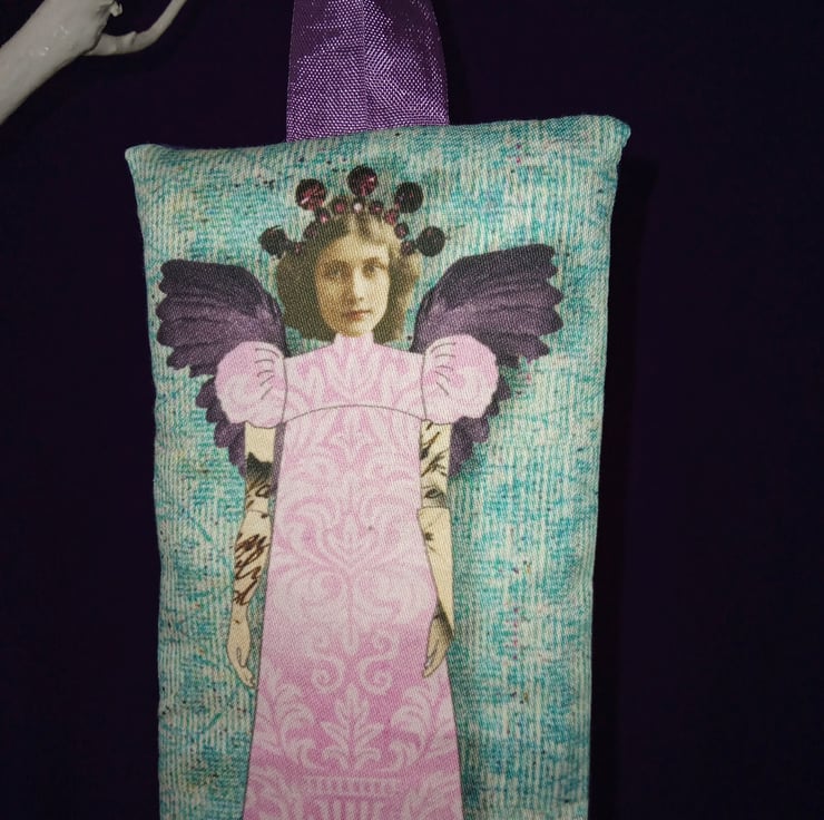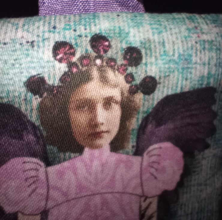 The image has been professionally printed on to an organic cotton satin mix fabric, The middle is firm with a wadding surround so it feels lightly padded, the piece measures 18x8x1cm with a length of gorgeous purple ribbon so you can hang her up wherever you like.