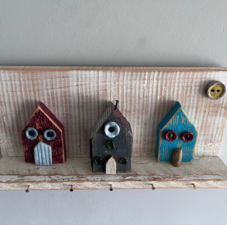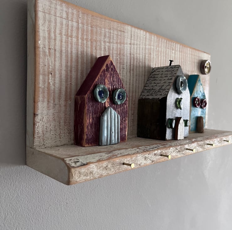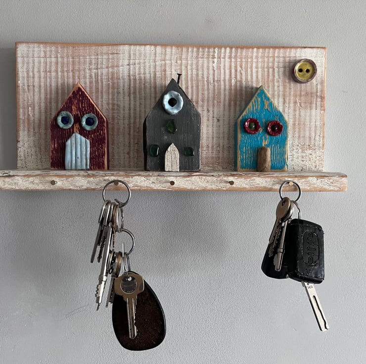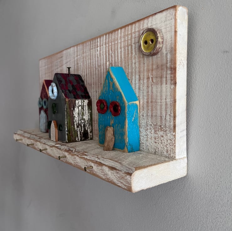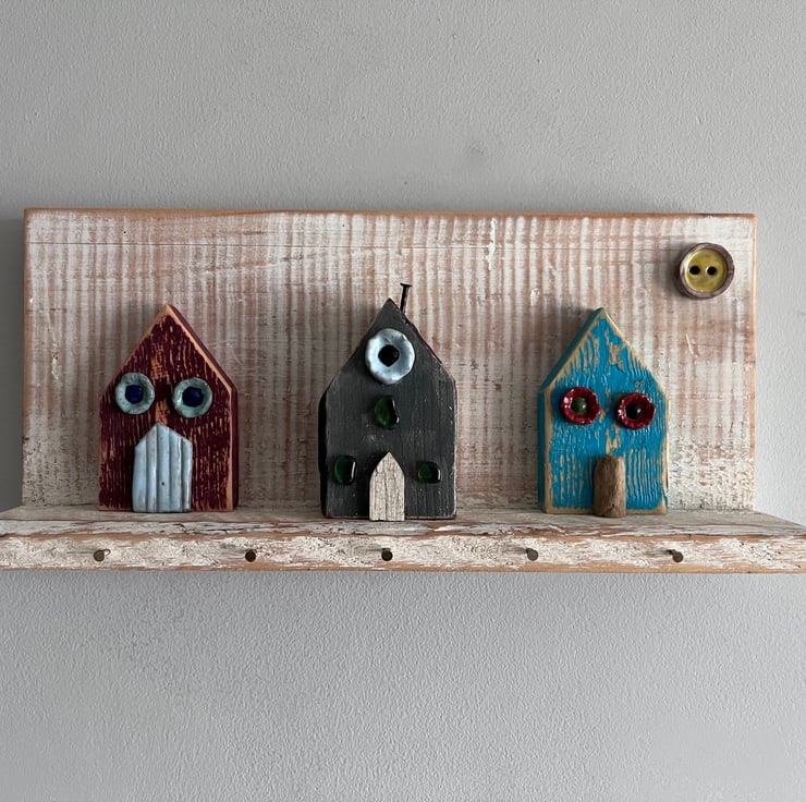 Key rack made from wood with ceramic flowers wooden houses painted with glass windows and a yellow button and nails for holding the keys…nail chimney with French writing on the roof…355mm wide x 160mm high & 75mm deep finished in white shabby chic worn out look…crocodile fixing on the back…thanks for looking…