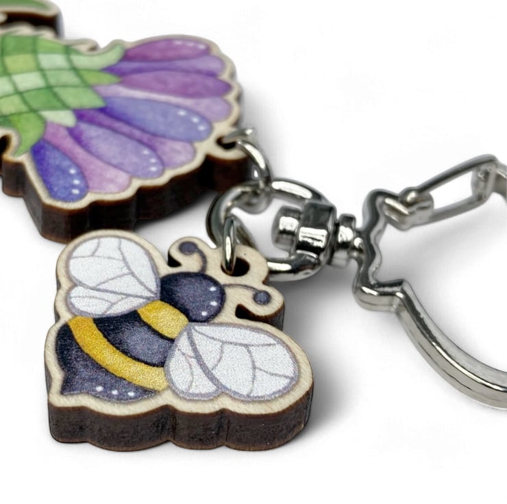 A cute keyring with two hanging charms, a purple Scottish thistle and a tiny bee. Crafted from beautiful maple wood, the charms are laser-cut. The ring itself is a lovely silver shell design with a simple push clasp for attaching your keys.