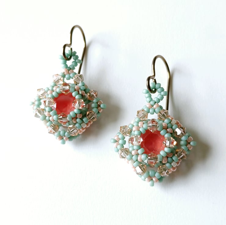 This pair of earrings features an 8mm Austrian crystal chaton in coral (the centre) - encased in yet more sparkly Austrian 3mm bicones in light peach. The earrings have been finished with a pretty border of seed beads in soft seafoam mint, salmon pink and ivory. I should give a quick mention to the reverse of these earrings - all neatly beaded!