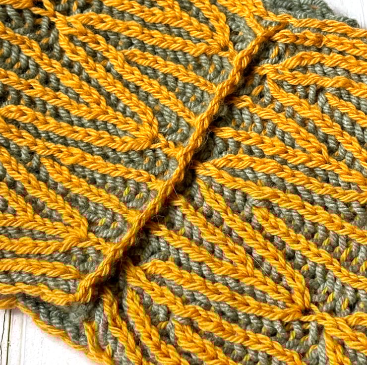 Hand-knitted in Sandra’s signature design, this wool and acrylic blend snood combines warmth with modern style. The intricate brioche stitch creates a bold geometric pattern that is fully reversible, offering two stunning looks in one. In vibrant mustard and apple green, this snood is the perfect accessory to add texture, color, and coziness to any outfit.