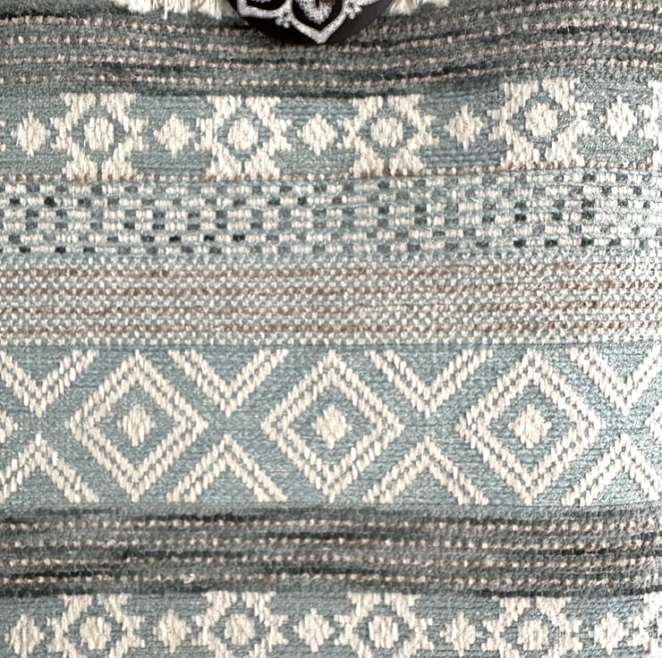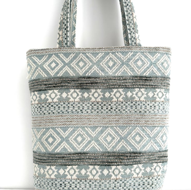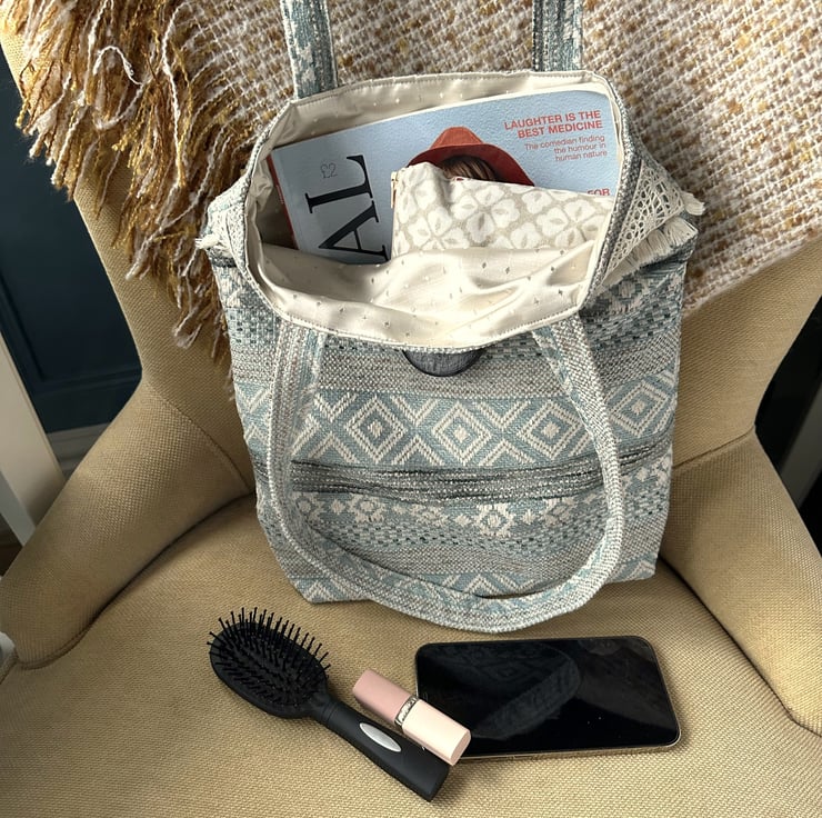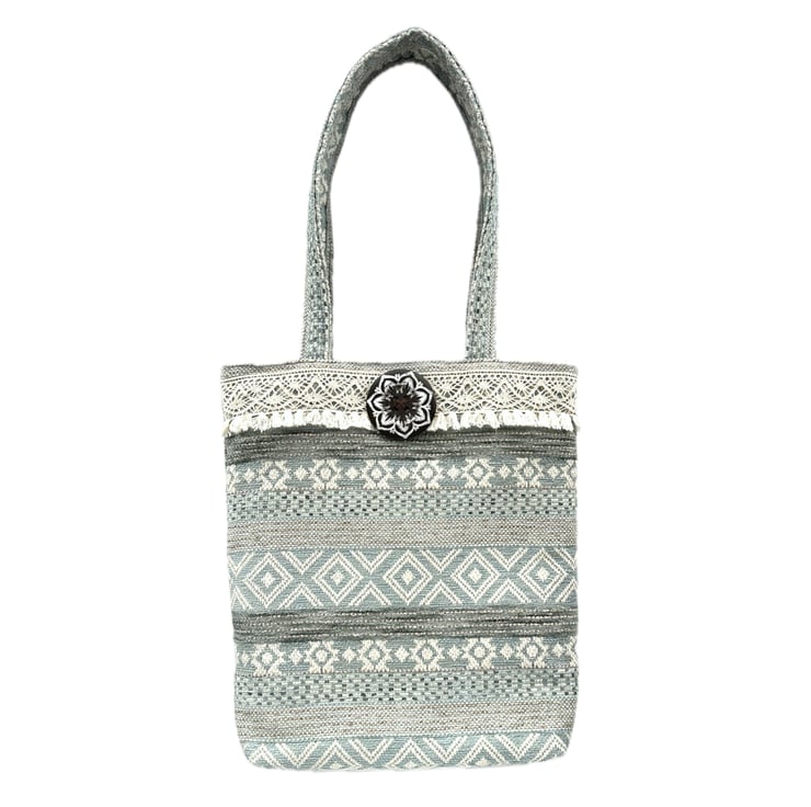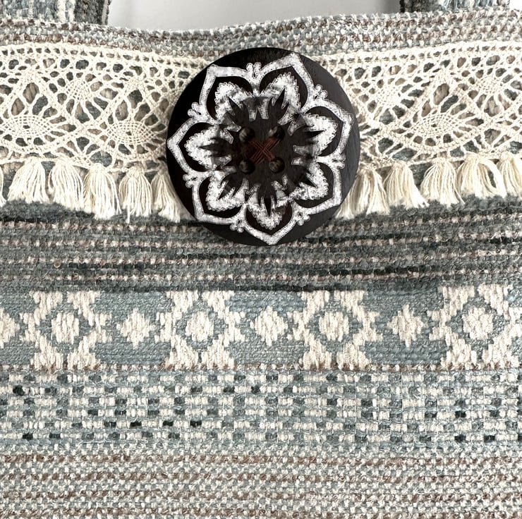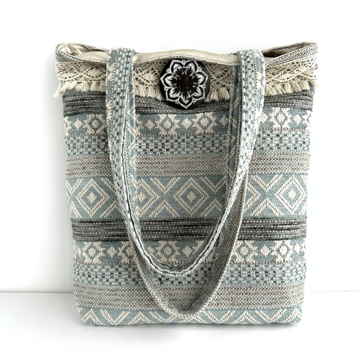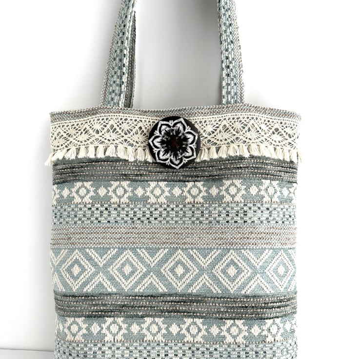 This delightful boho-style tote bag is made from patterned upholstery fabric with a decorative cotton lace trim and statement button. The bag fabric has a woven tribal-style pattern featuring geometric motifs and narrow stripes, in a repeating wide stripe layout. The pattern is depicted in attractive shades of pale blue, teal, cream and beige. The fabric has a textured finish, almost reminiscent of chenille. The front top edge of the bag is decorated with cream cotton lace trim, with a fringed lower edge. To the centre of the lace trim, I’ve added a large dark wood-effect button with a bold white floral pattern. The bag is lined with pale gold satin fabric, with a woven pattern of tiny diamond shapes.