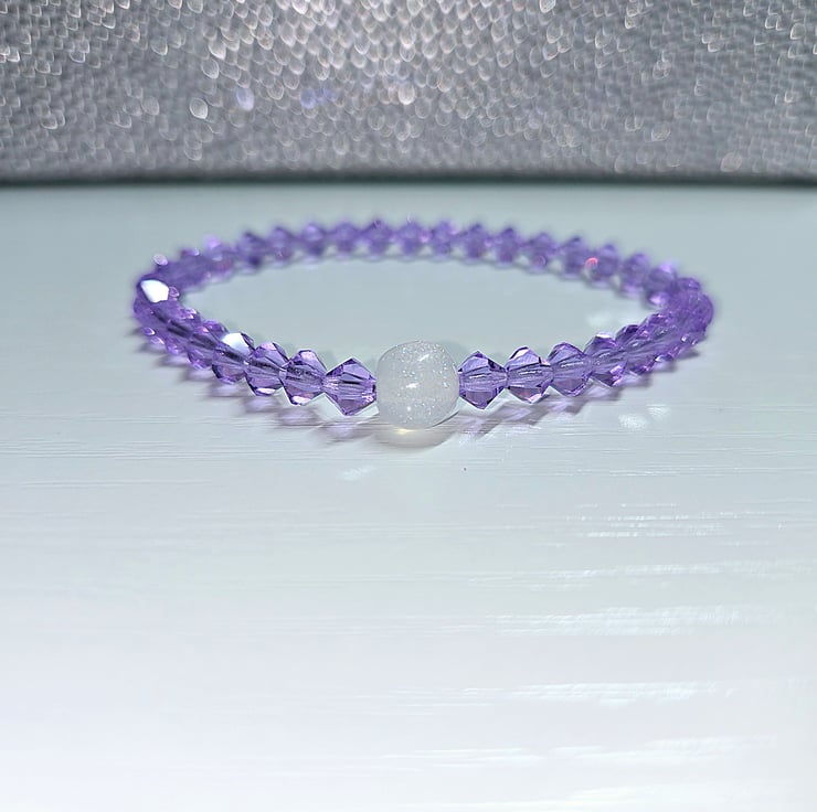 Hand made to order this super sparkly Stretchy Bracelet is made with 6mm Bicone Violet Preciosa Crystals, it looks beautiful from any angle when the light hits it and is finished off with a sparkly 8mm Resin Bead giving it a bespoke luxury finish.
