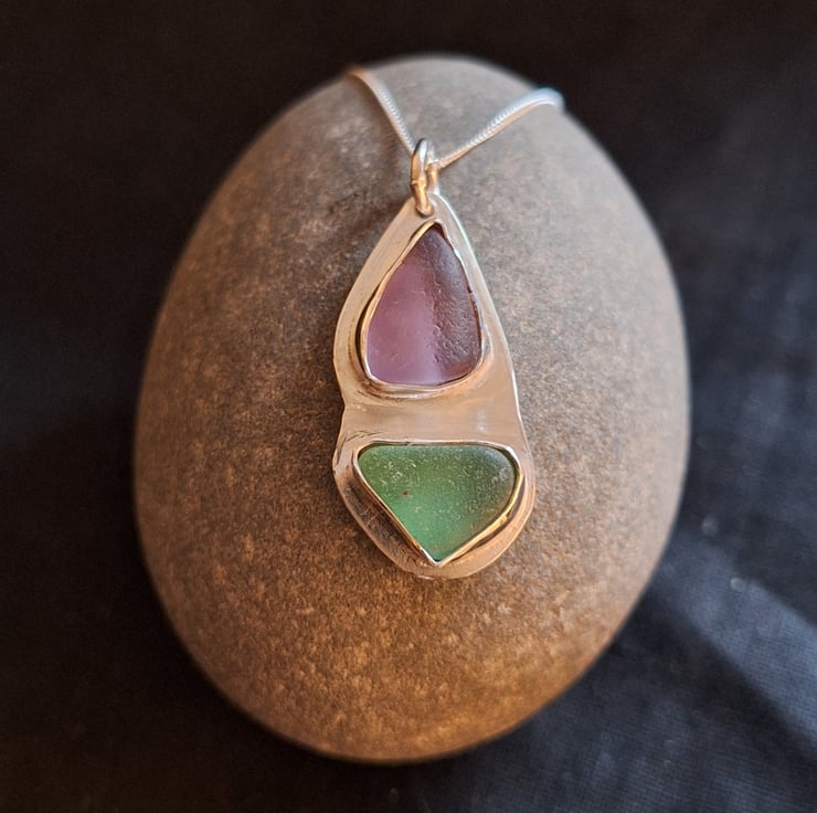 Two stunning pieces of seaglass have been set on a lovely matt free form piece of silver. Lilac seaglass is pretty rare and this piece comes for a beach on La Graciosa in the Canary Islands. It has been paired with a lovely green almost heart shaped piece to form a unique piece of jewellery.
