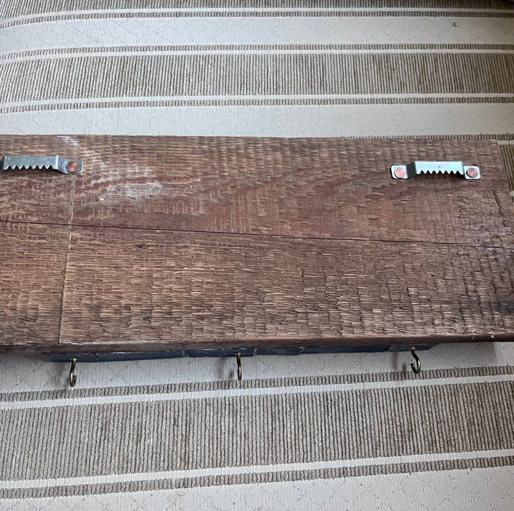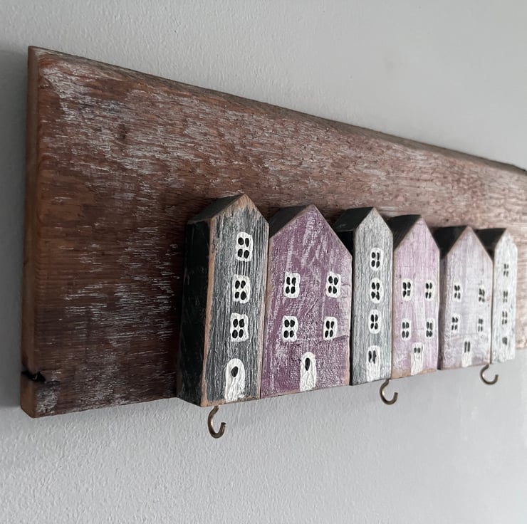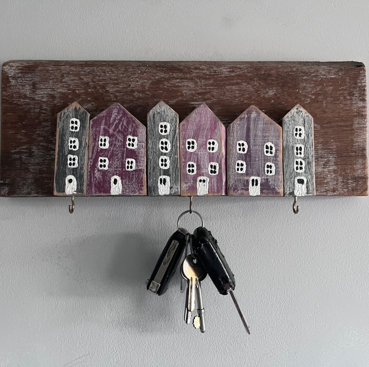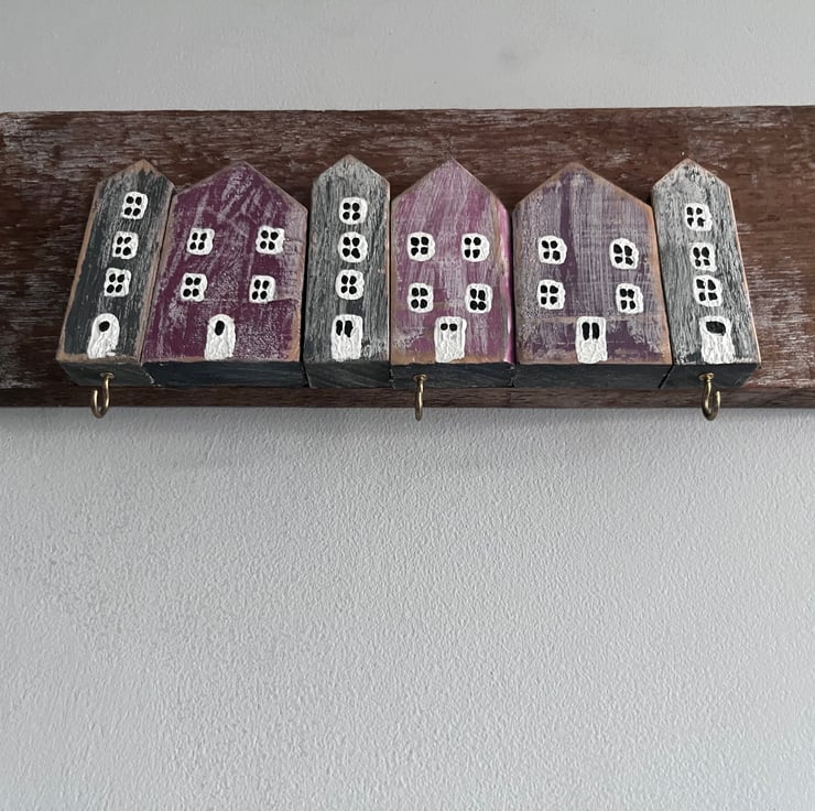 Wooden key rack made with reclaimed wood…painted houses with hooks for keys …a shabby chic finish street style…black /purple with white and black windows…350mm wide x 150mm high approximately 45mm thick…crocodile fixings on the back…thanks for looking…