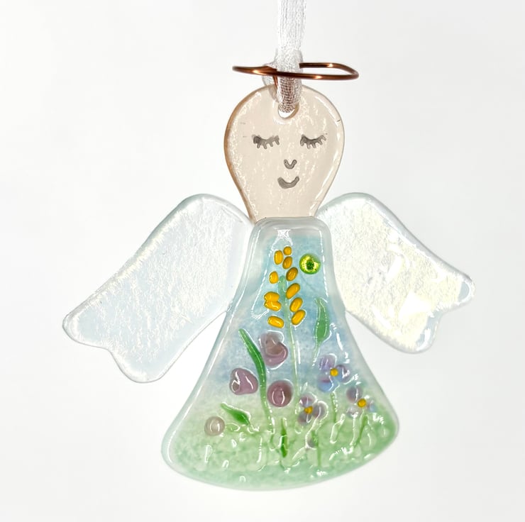 This gorgeous angel is a mini work of art and no two are the same. It has had two firings in the kiln and the detail is made up from tiny pieces of lamp worked glass. She has pretty iridescent wings and a little copper halo.
