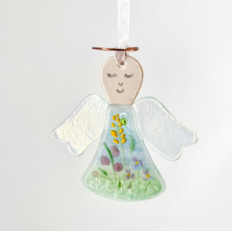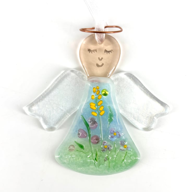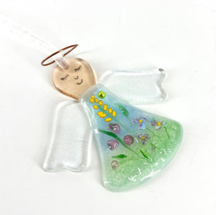 Fused and lamp worked hanging glass angel with pretty pink and yellow flowers.