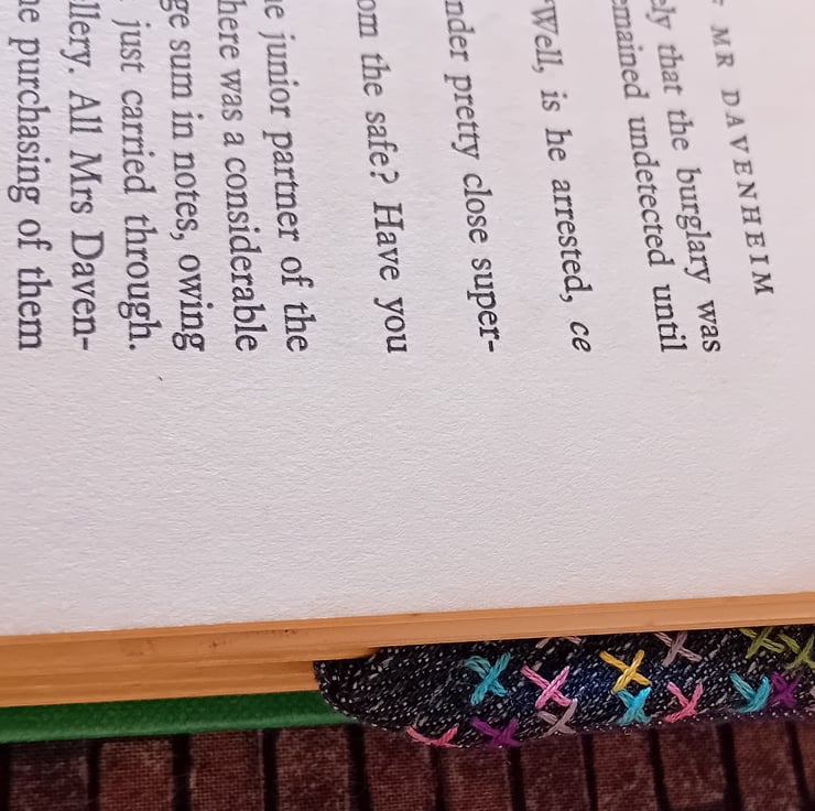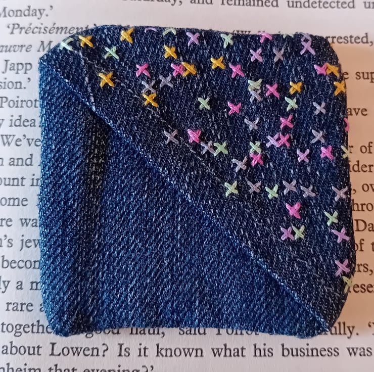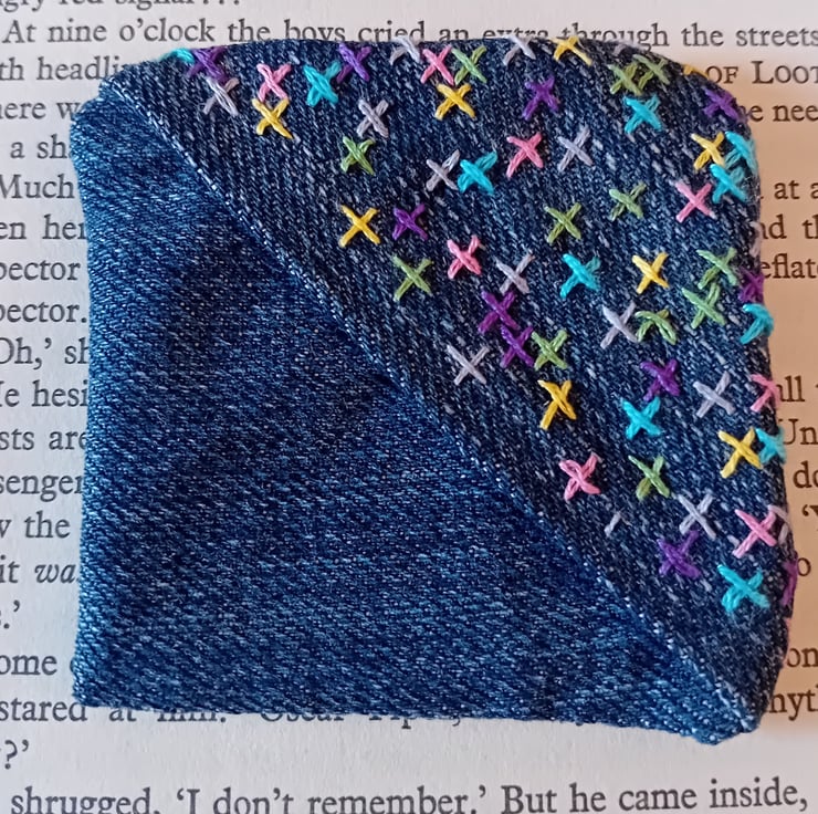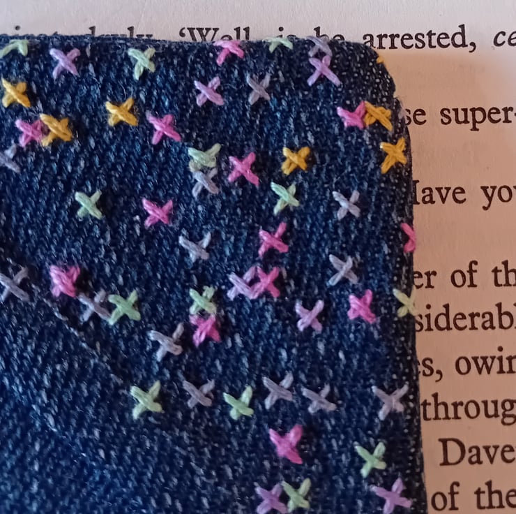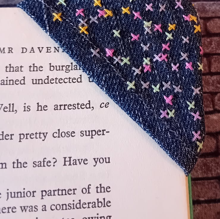 This denim bookmark is a perfect mix of rugged and vibrant, made from upcycled denim and brought to life with neon embroidery stitches that pop against the dark fabric.